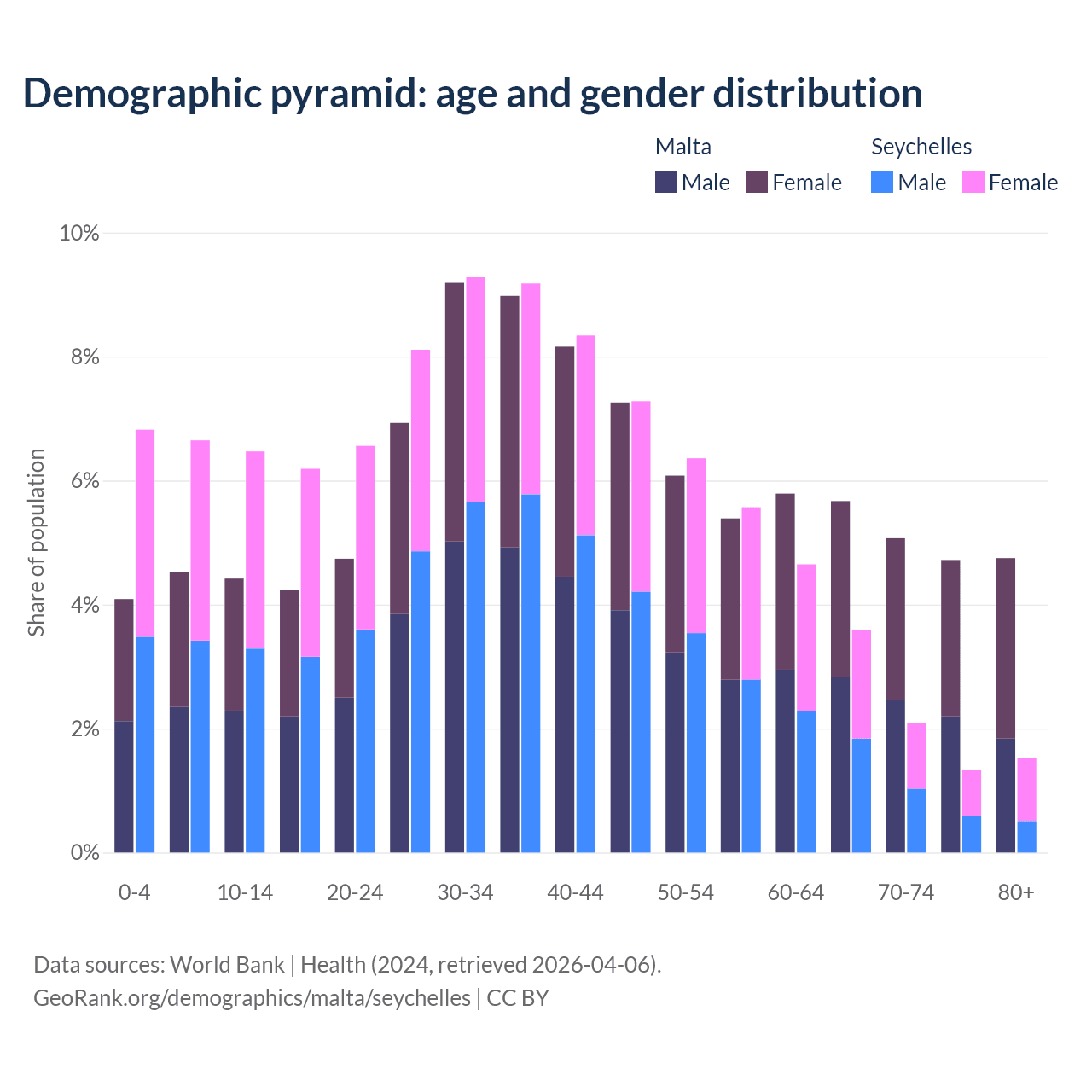 - The share of old-age demographic (65+) in Malta is 20.2% vs 8.54% in the Seychelles.