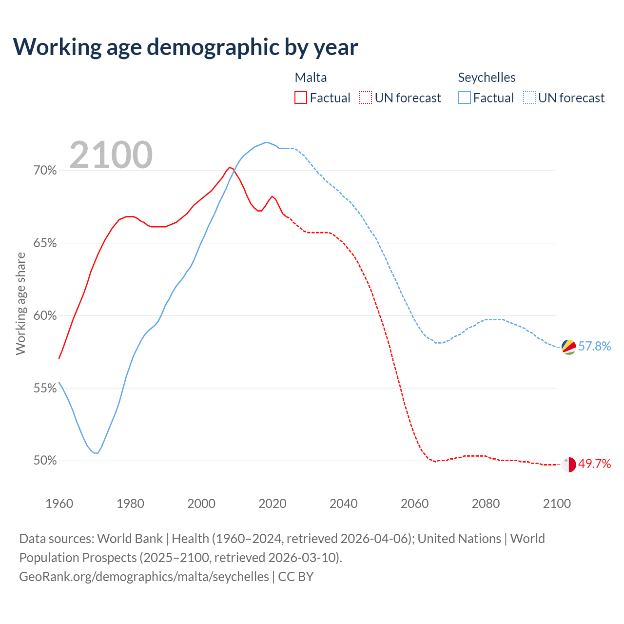 Median age Malta vs Seychelles, 1960-2100