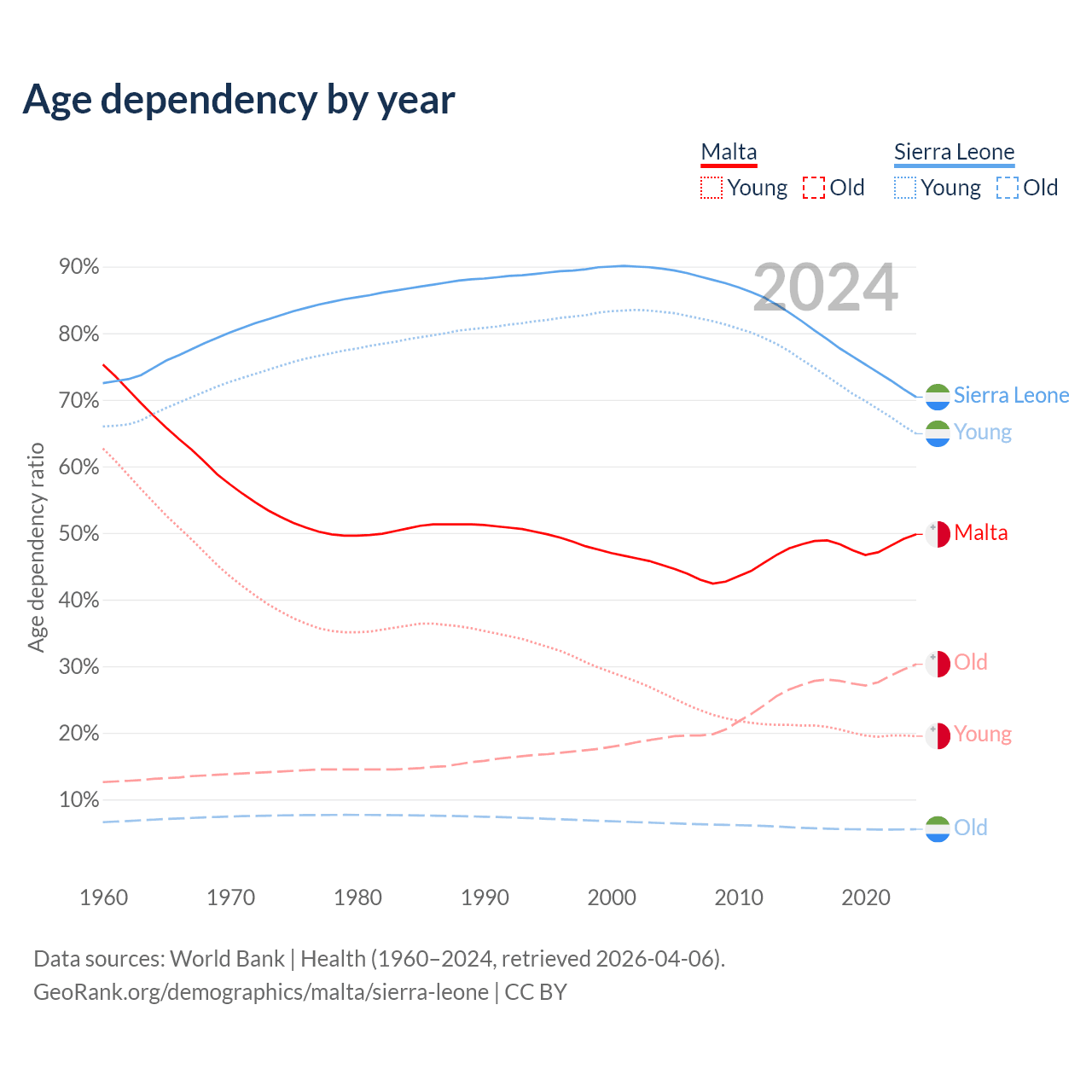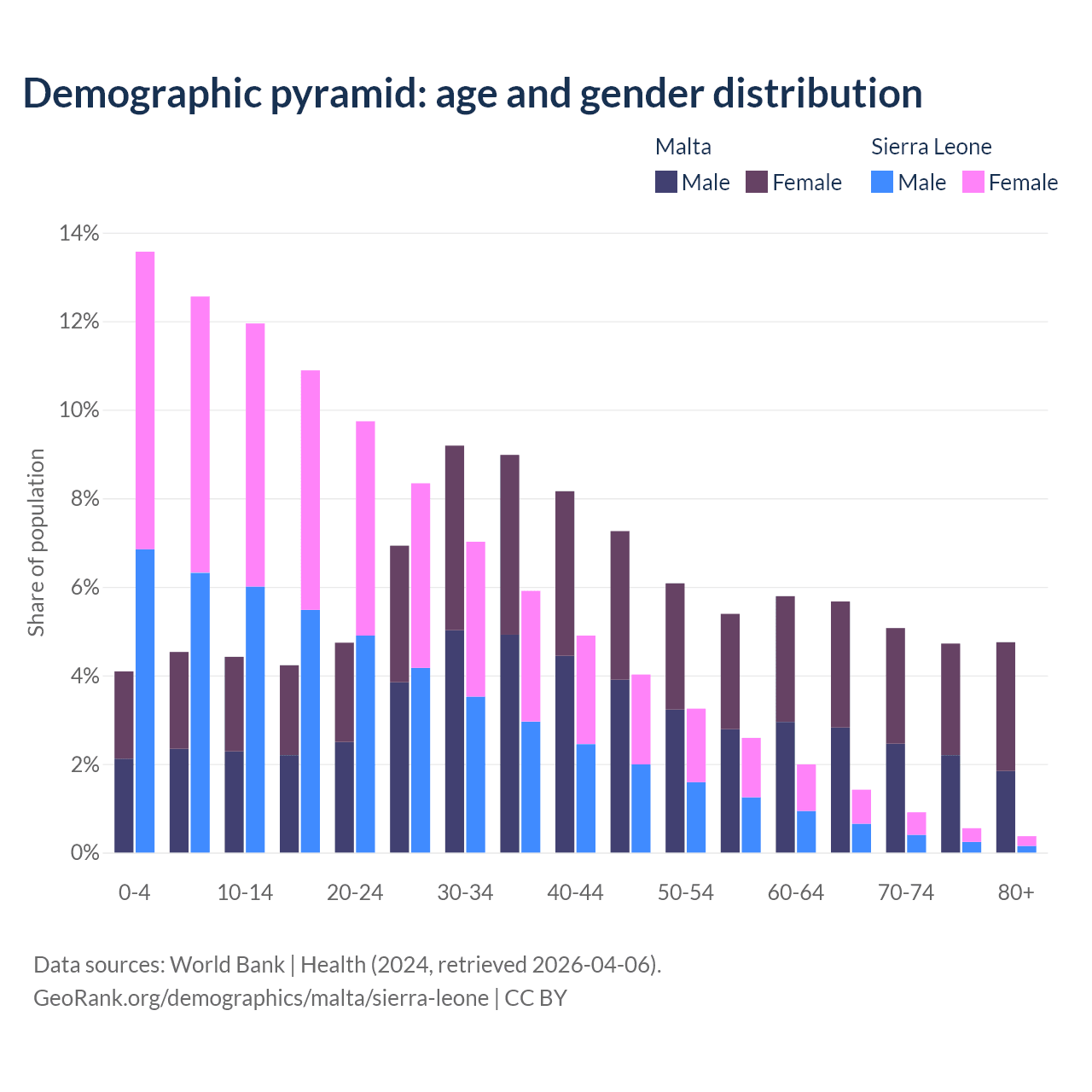 - The share of old-age demographic (65+) in Malta is 20.2% vs 3.24% in Sierra Leone.