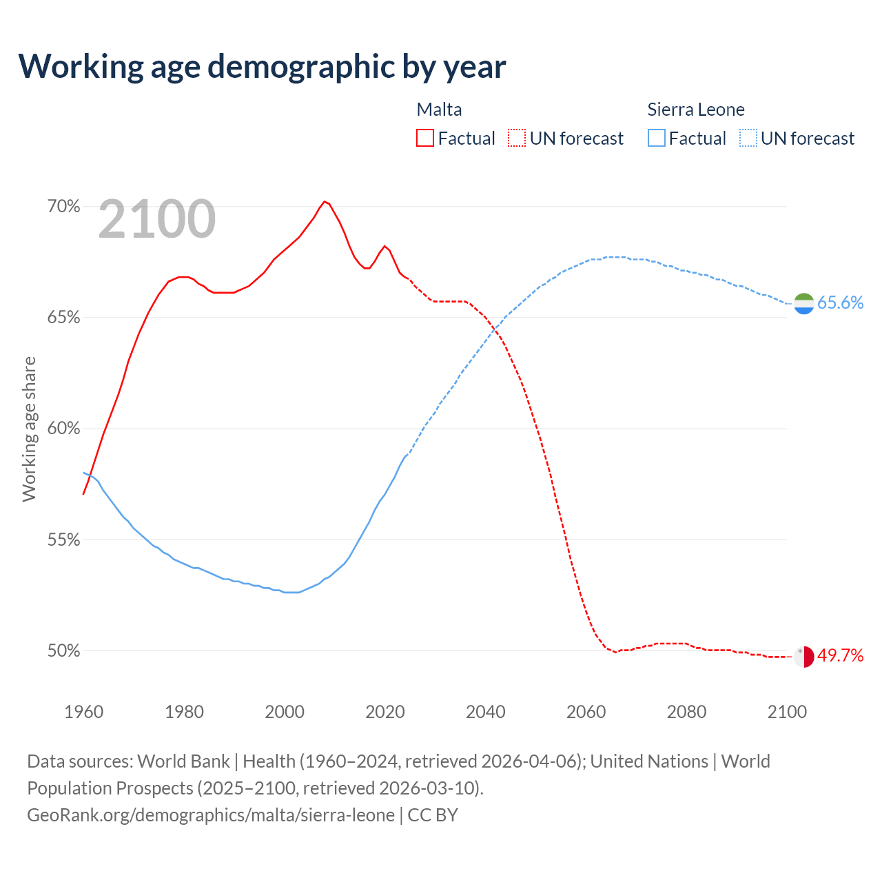 Median age Malta vs Sierra Leone, 1960-2100