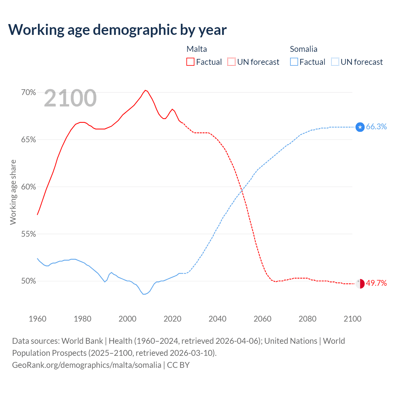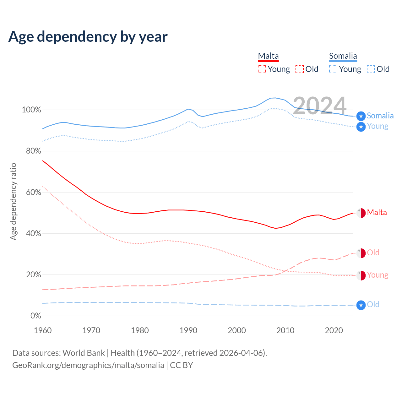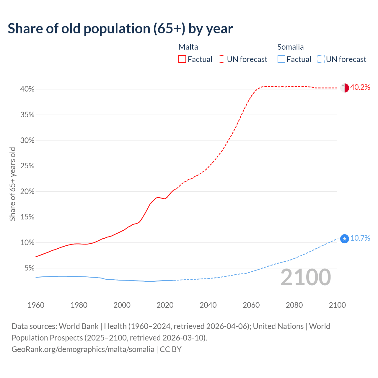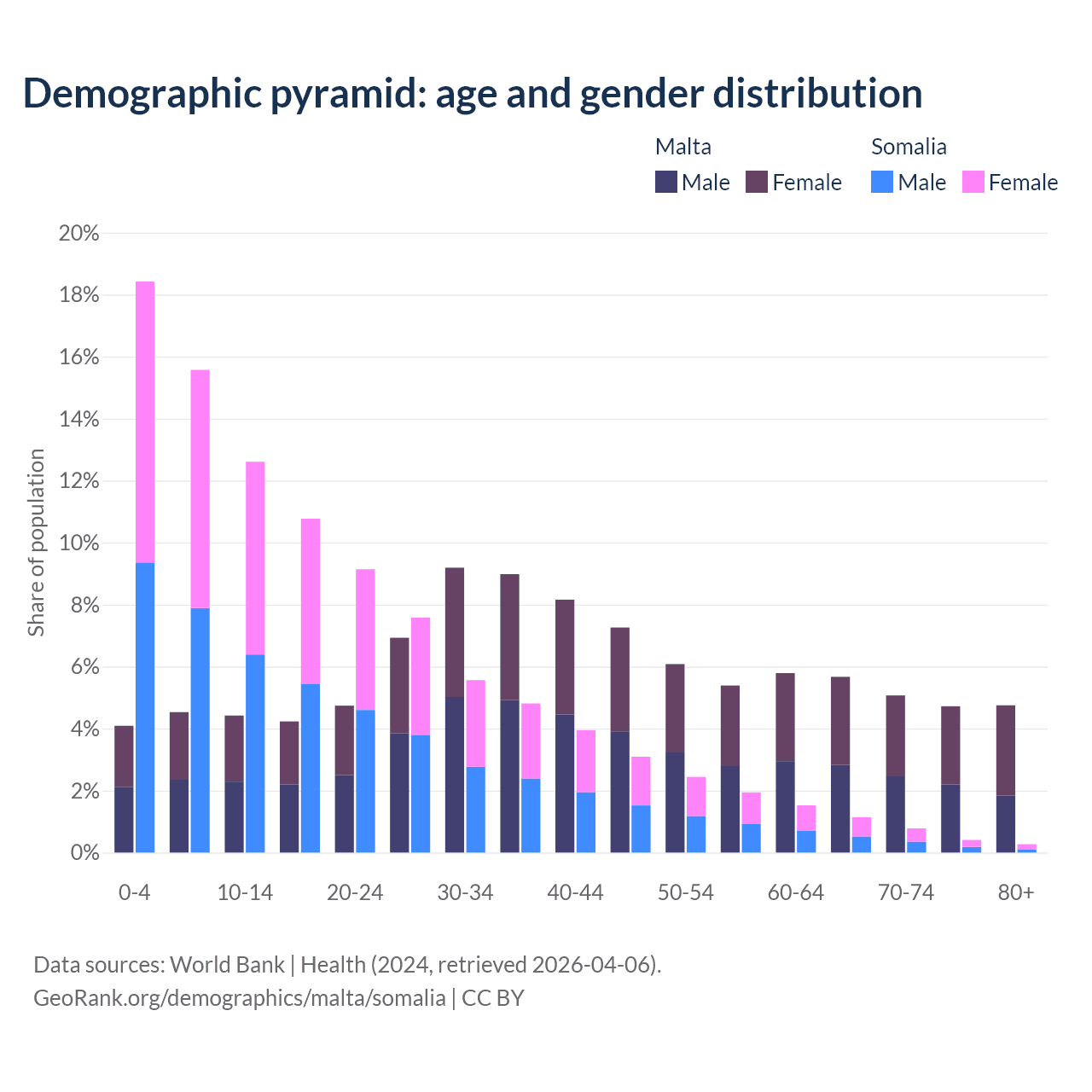 - The share of old-age demographic (65+) in Malta is 20.2% vs 2.59% in Somalia.