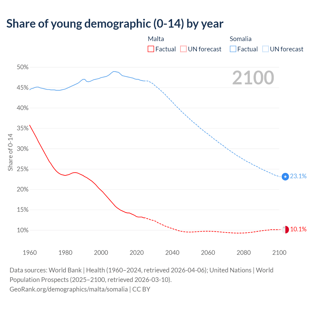 - The share of young demographic (0-15 years old) in Malta is 13% vs 46.6% in Somalia.