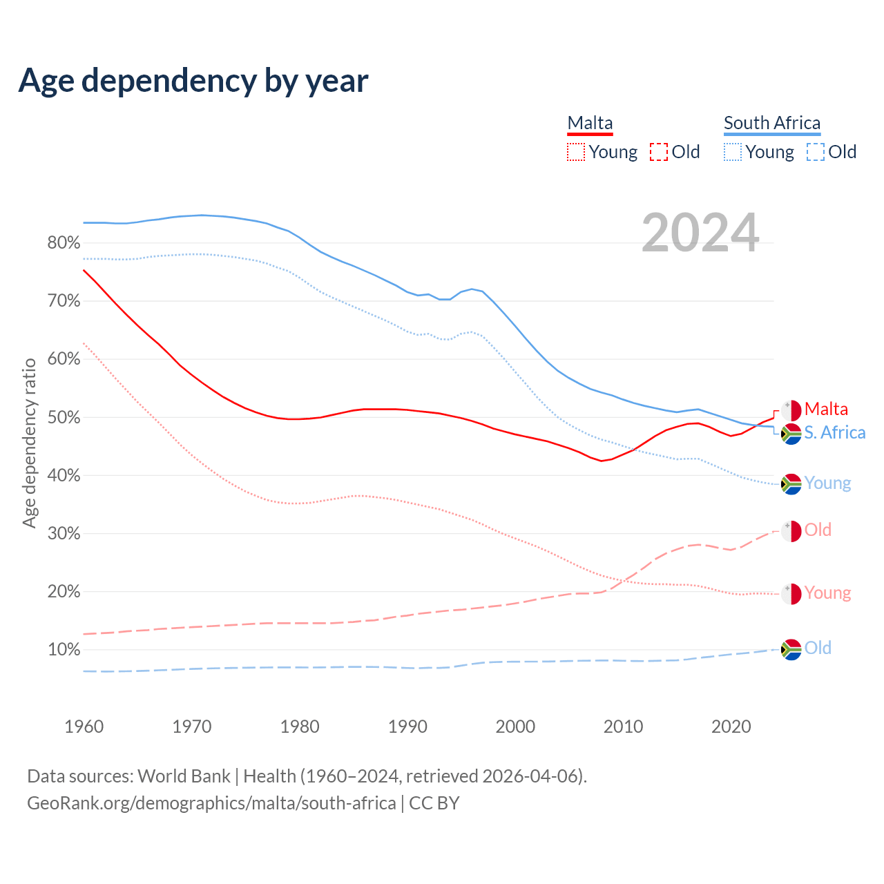 The share of older people aged 65 and over is 20.2% in Malta and 6.69% in South Africa. Life expectancy in Malta compared to South Africa .