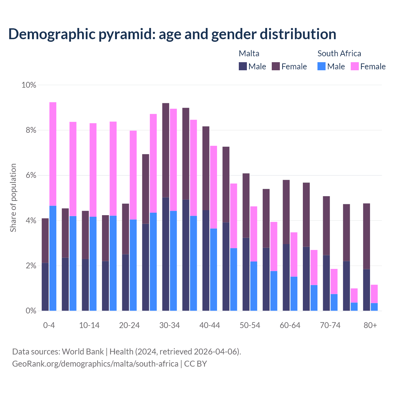 - Malta is ranked 36/196 by median age (oldest to youngest) vs 107/196 for South Africa.
