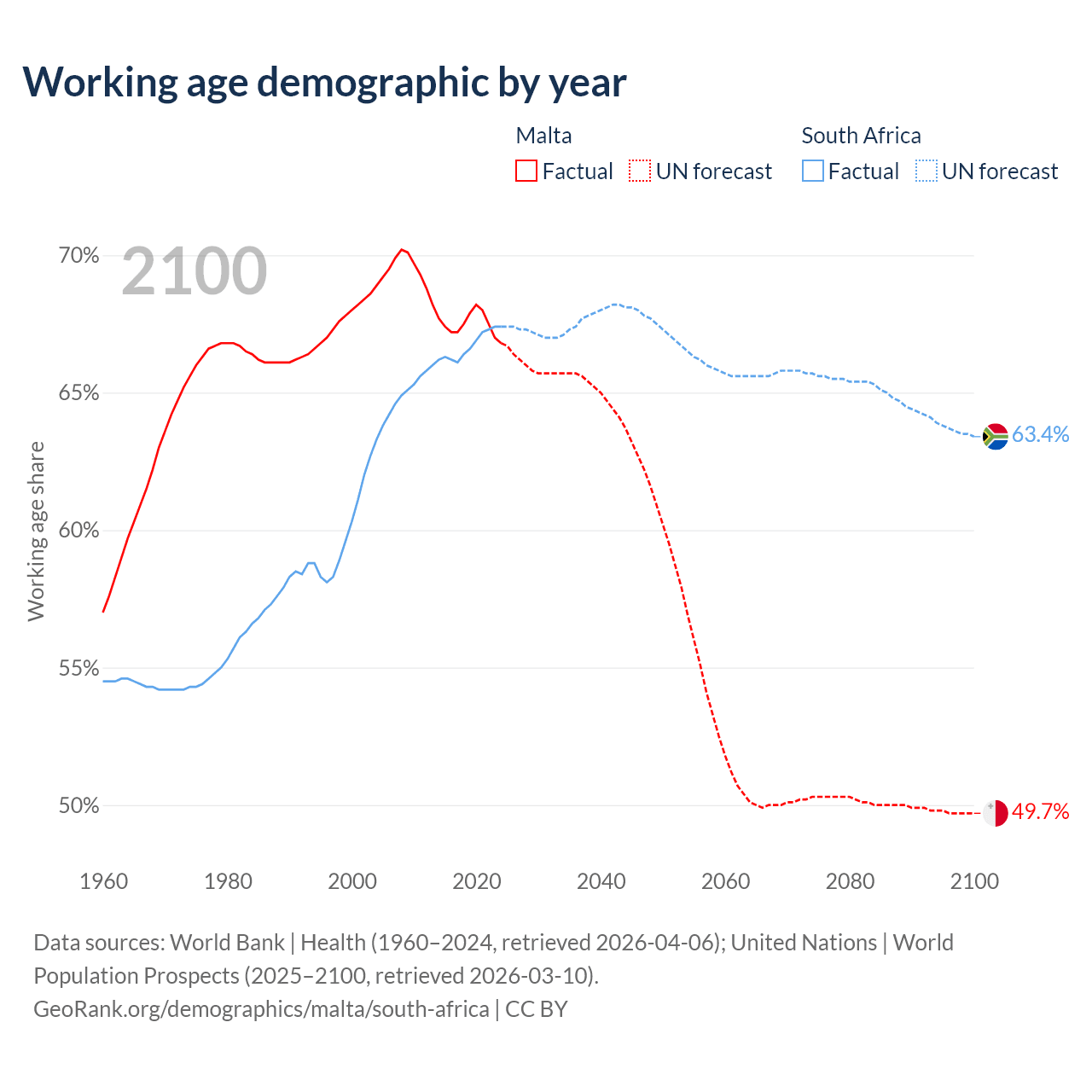 Median age Malta vs South Africa, 1960-2100