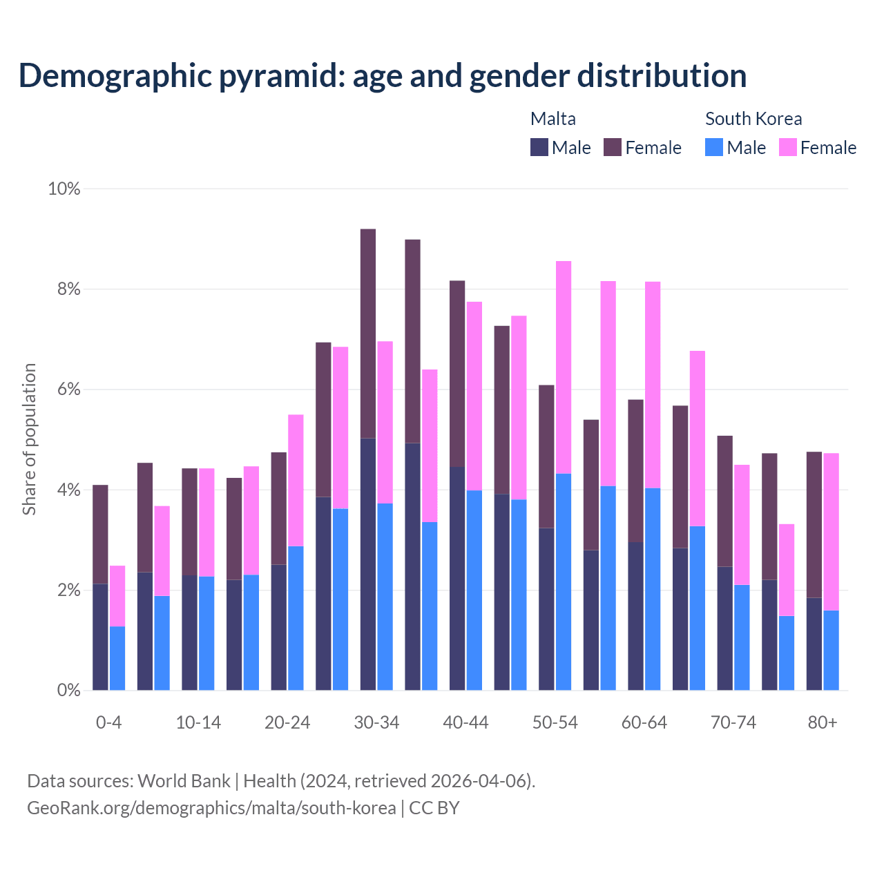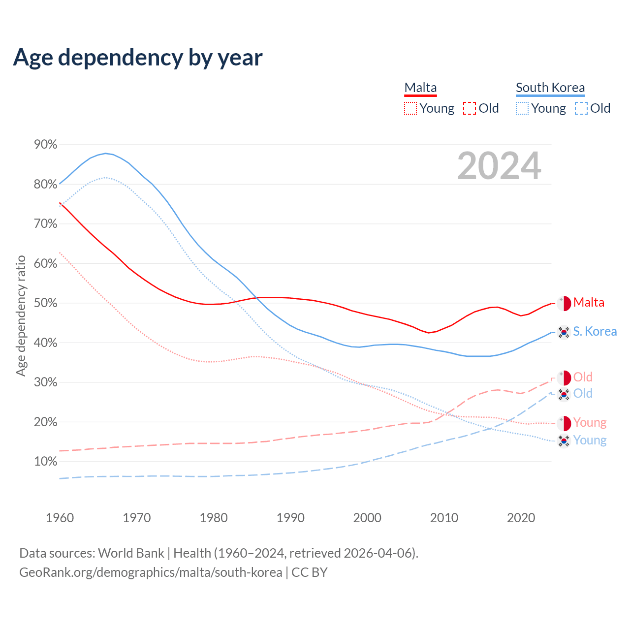 - Malta is ranked 36/196 by median age (oldest to youngest) vs 10/196 for South Korea.