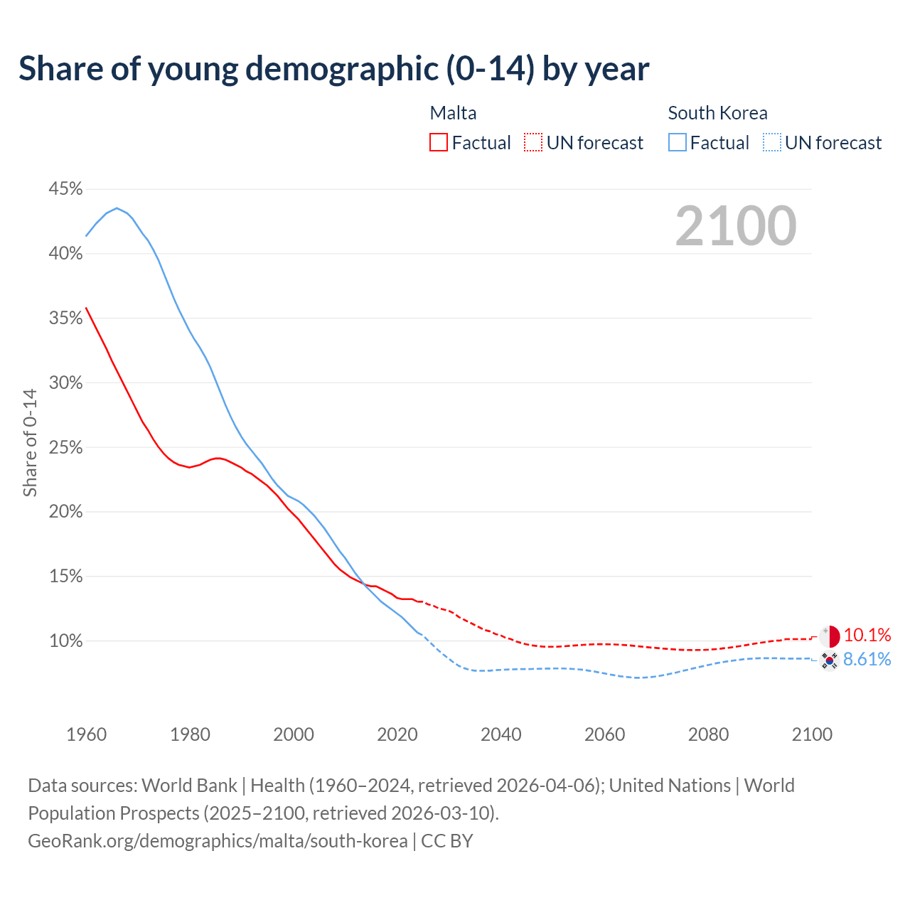 - The share of young demographic (0-15 years old) in Malta is 13% vs 10.6% in South Korea.