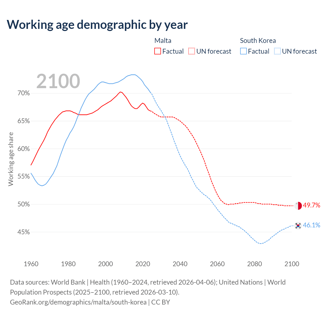 - Malta has 388K working age adults (aged 15-64) vs 36.2M in South Korea.