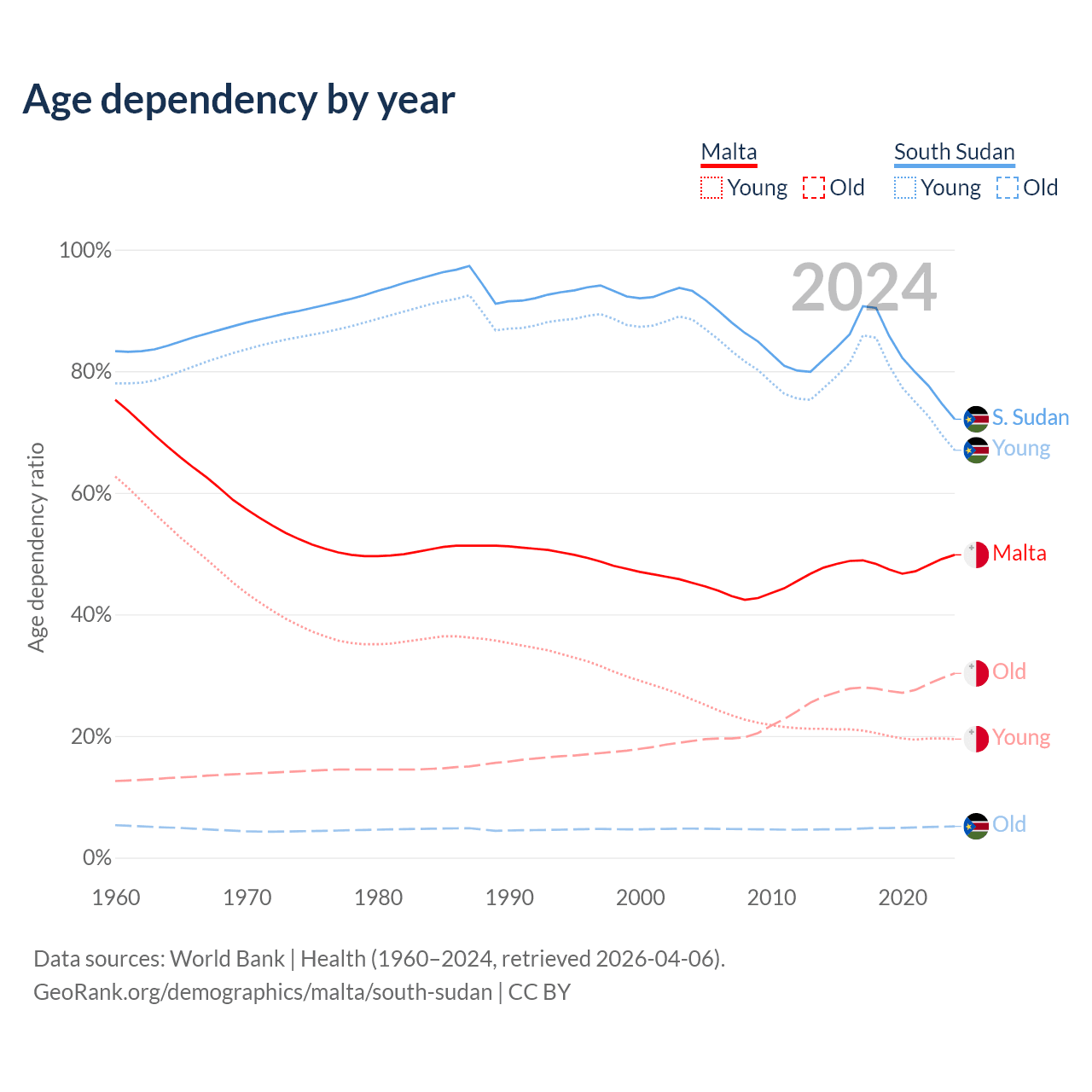 - The share of old-age demographic (65+) in Malta is 20.2% vs 2.99% in South Sudan.