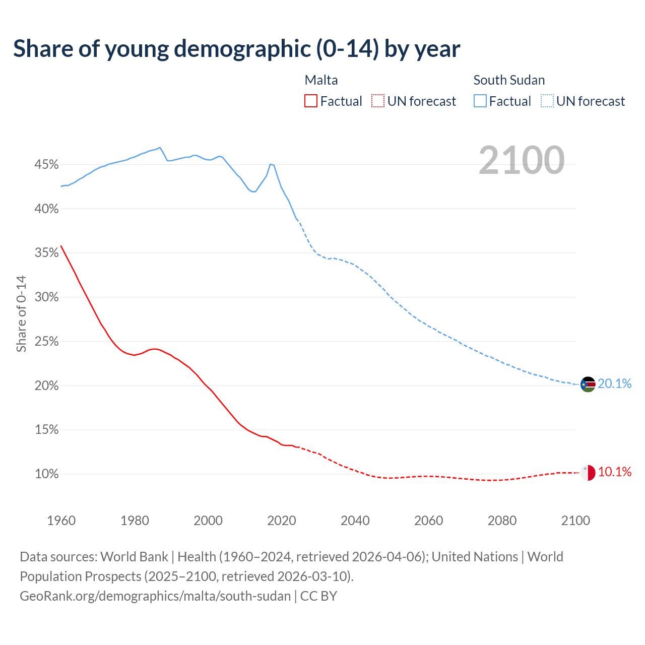 - The share of young demographic (0-15 years old) in Malta is 13% vs 38.9% in South Sudan.