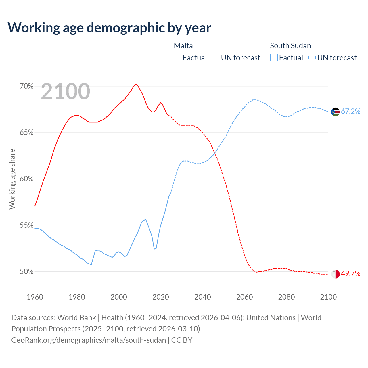 Median age Malta vs South Sudan, 1960-2100
