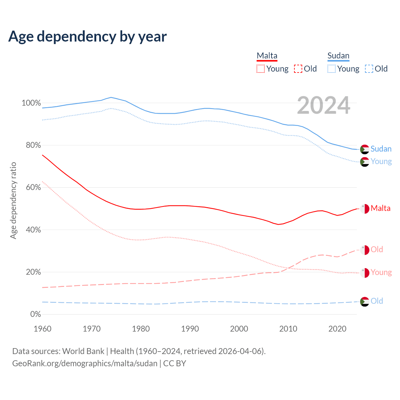 - The share of old-age demographic (65+) in Malta is 20.2% vs 3.3% in Sudan.