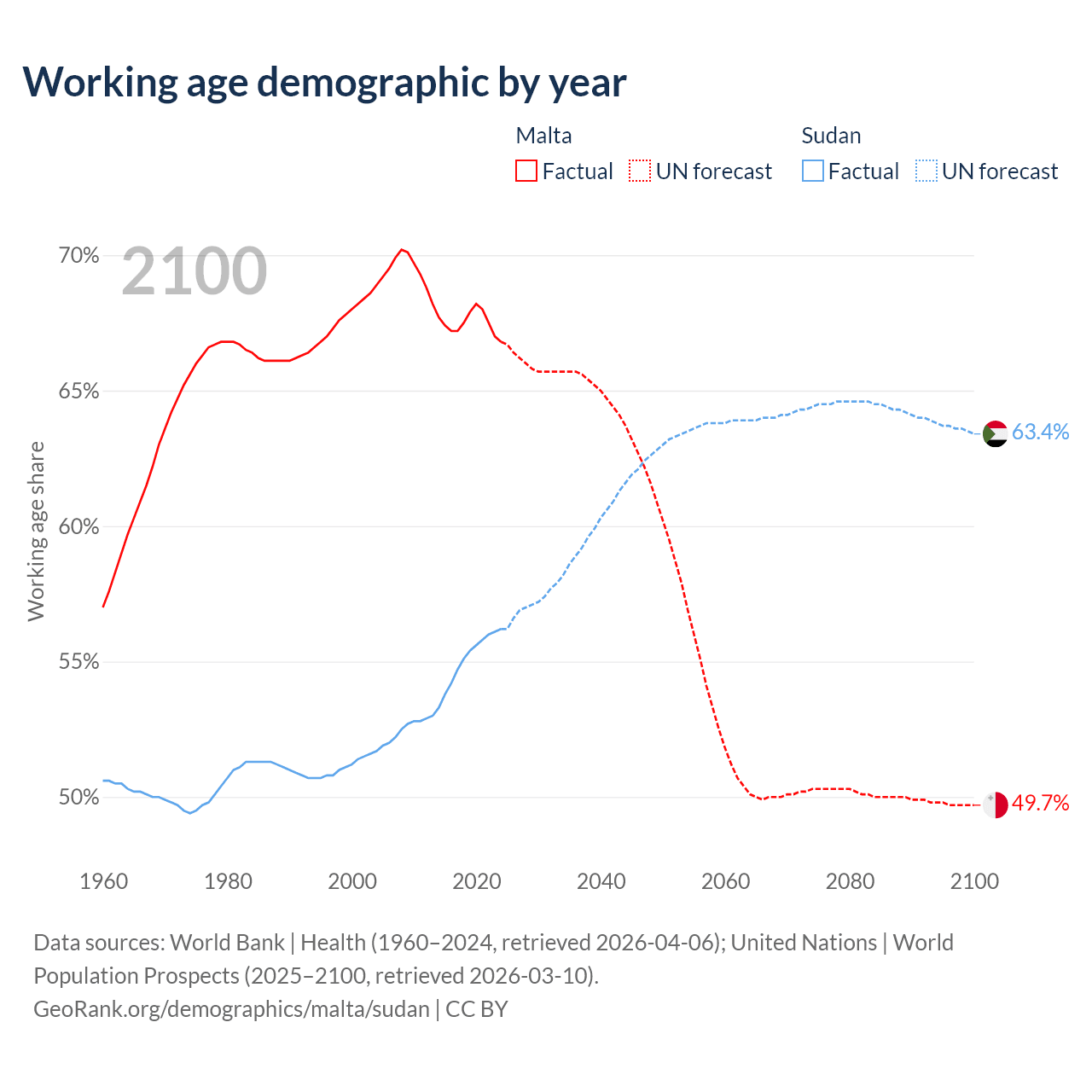 Median age Malta vs Sudan, 1960-2100
