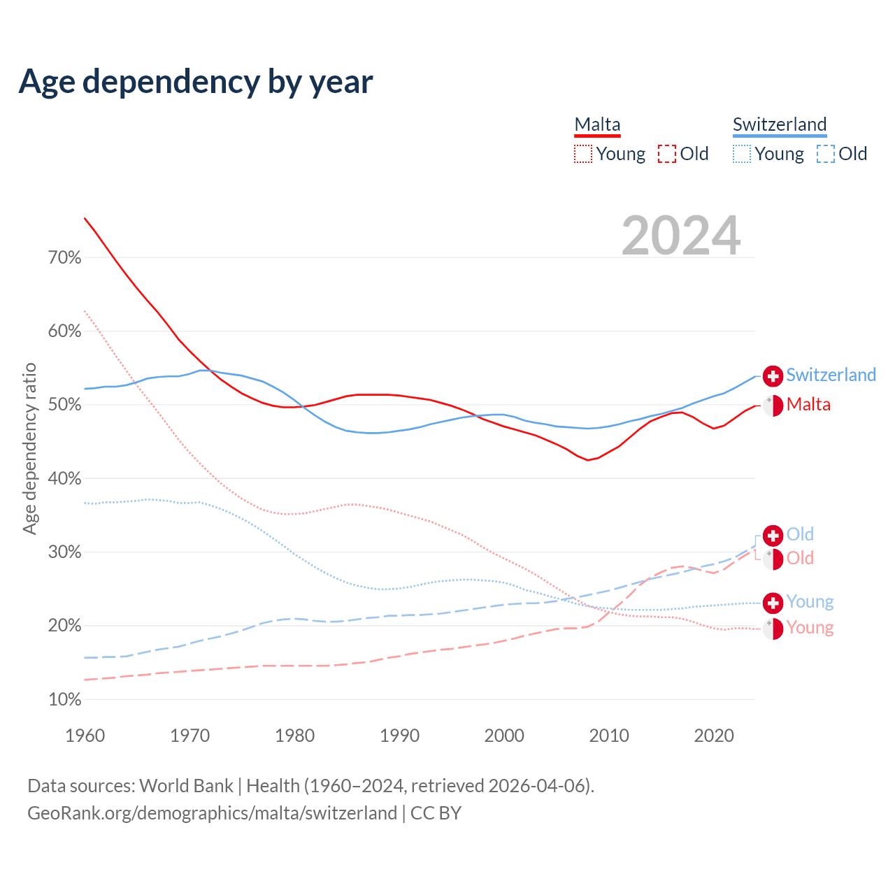 The share of older people aged 65 and over is 20.2% in Malta and 20% in Switzerland. Life expectancy in Malta compared to Switzerland .