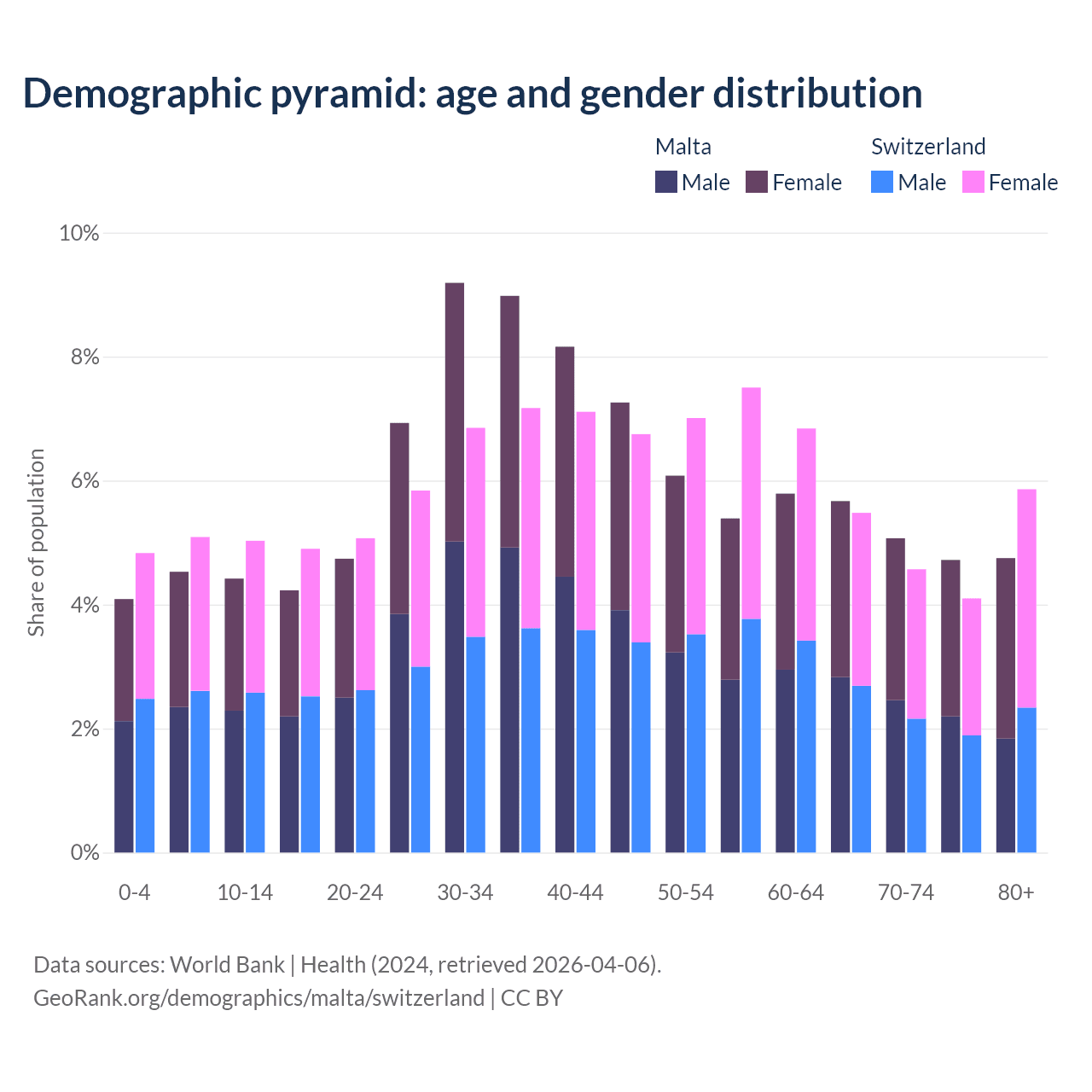 - Malta is ranked 36/196 by median age (oldest to youngest) vs 24/196 for Switzerland.