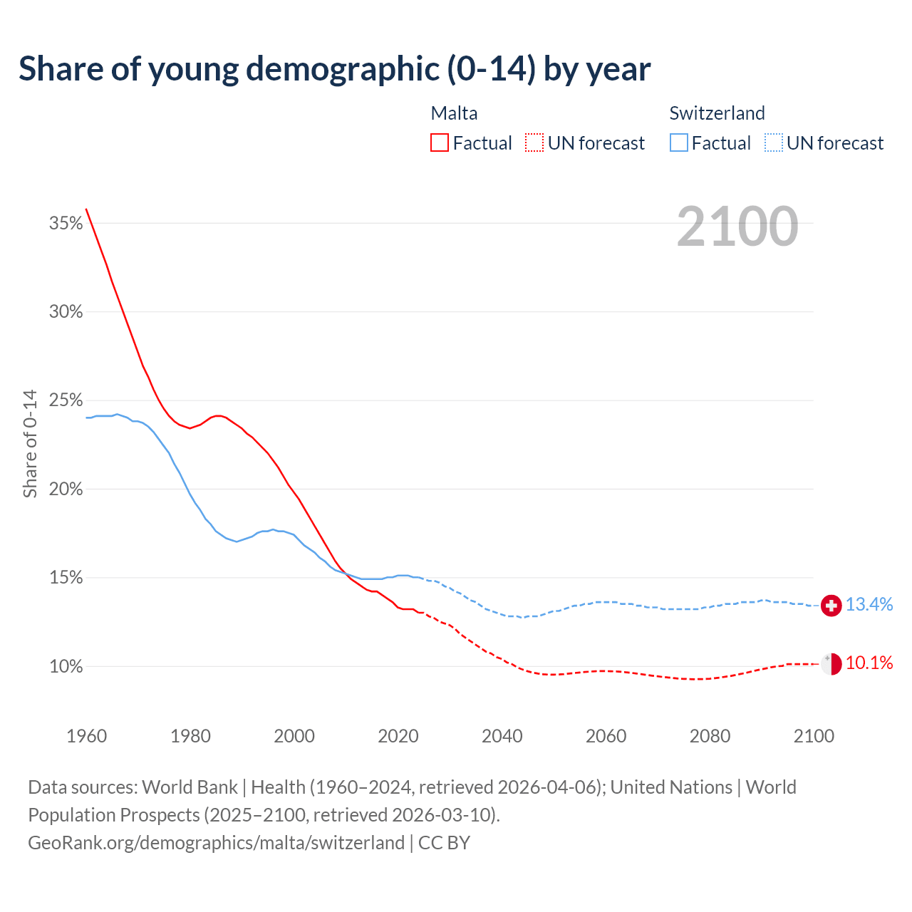 - The share of young demographic (0-15 years old) in Malta is 13% vs 15% in Switzerland.