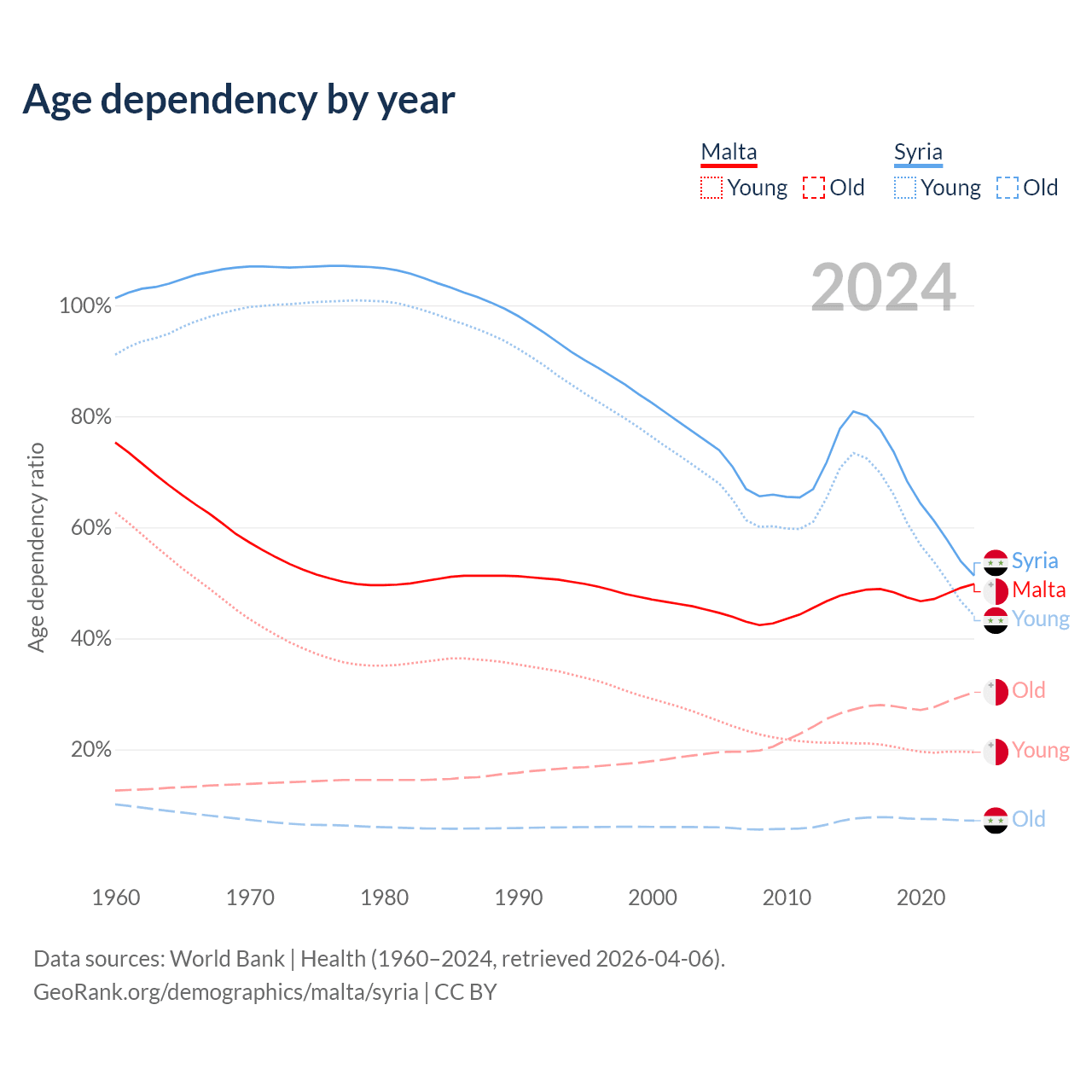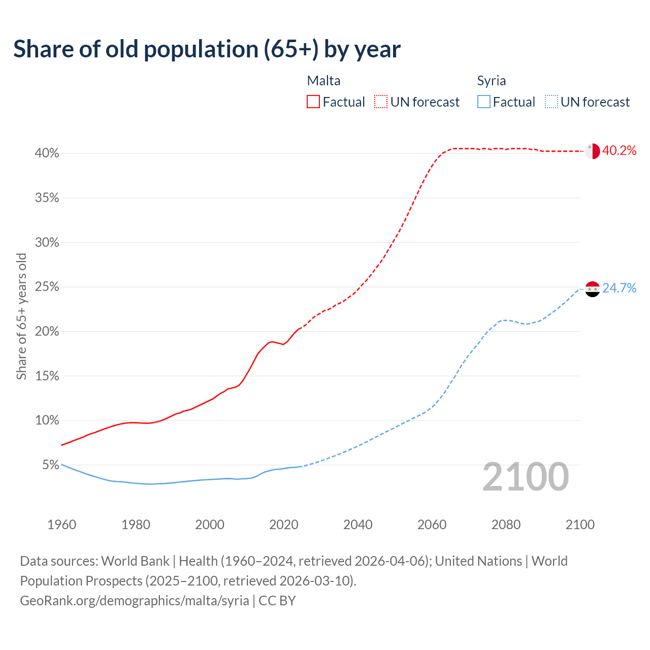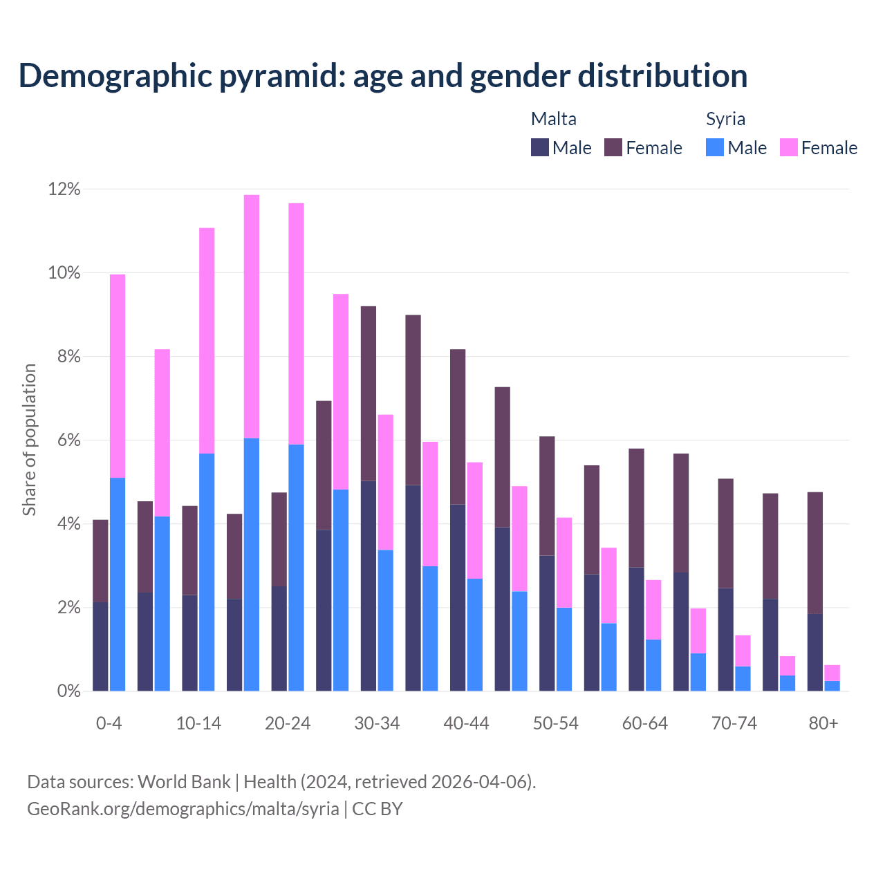 - The share of old-age demographic (65+) in Malta is 20.2% vs 4.74% in Syria.