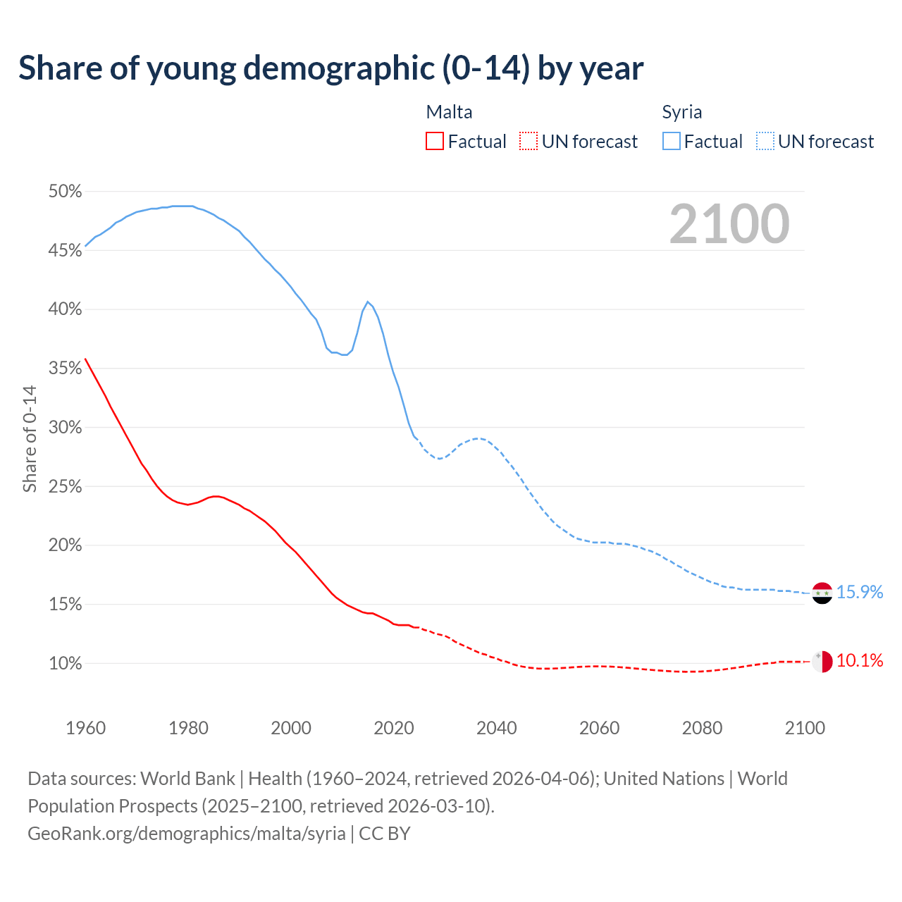 - The share of young demographic (0-15 years old) in Malta is 13% vs 29.2% in Syria.