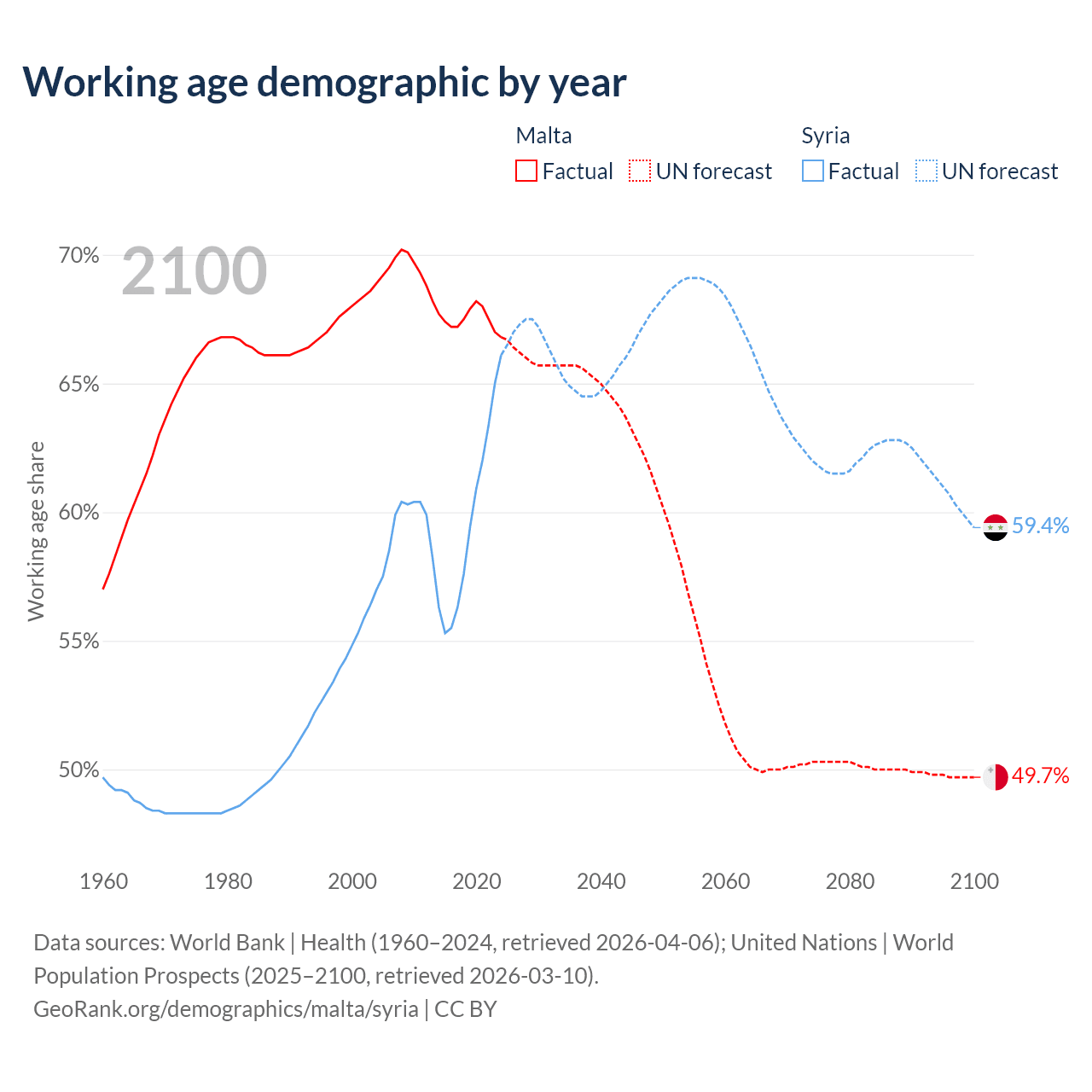 The share of older people aged 65 and over is 20.2% in Malta and 4.74% in Syria. Life expectancy in Malta compared to Syria .