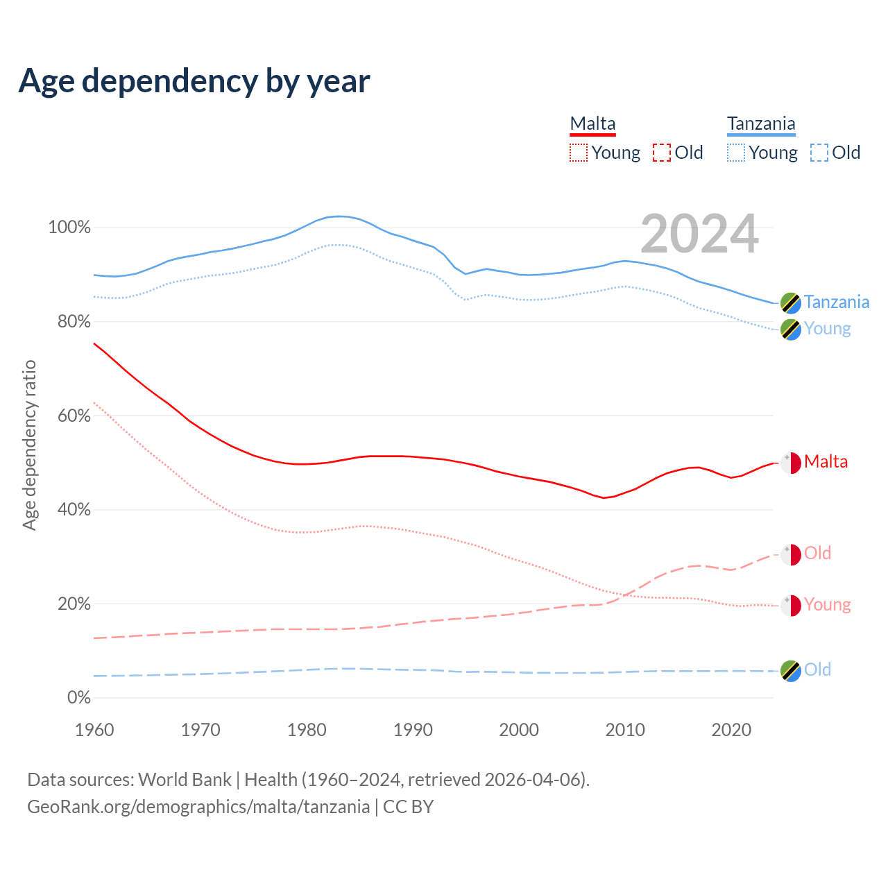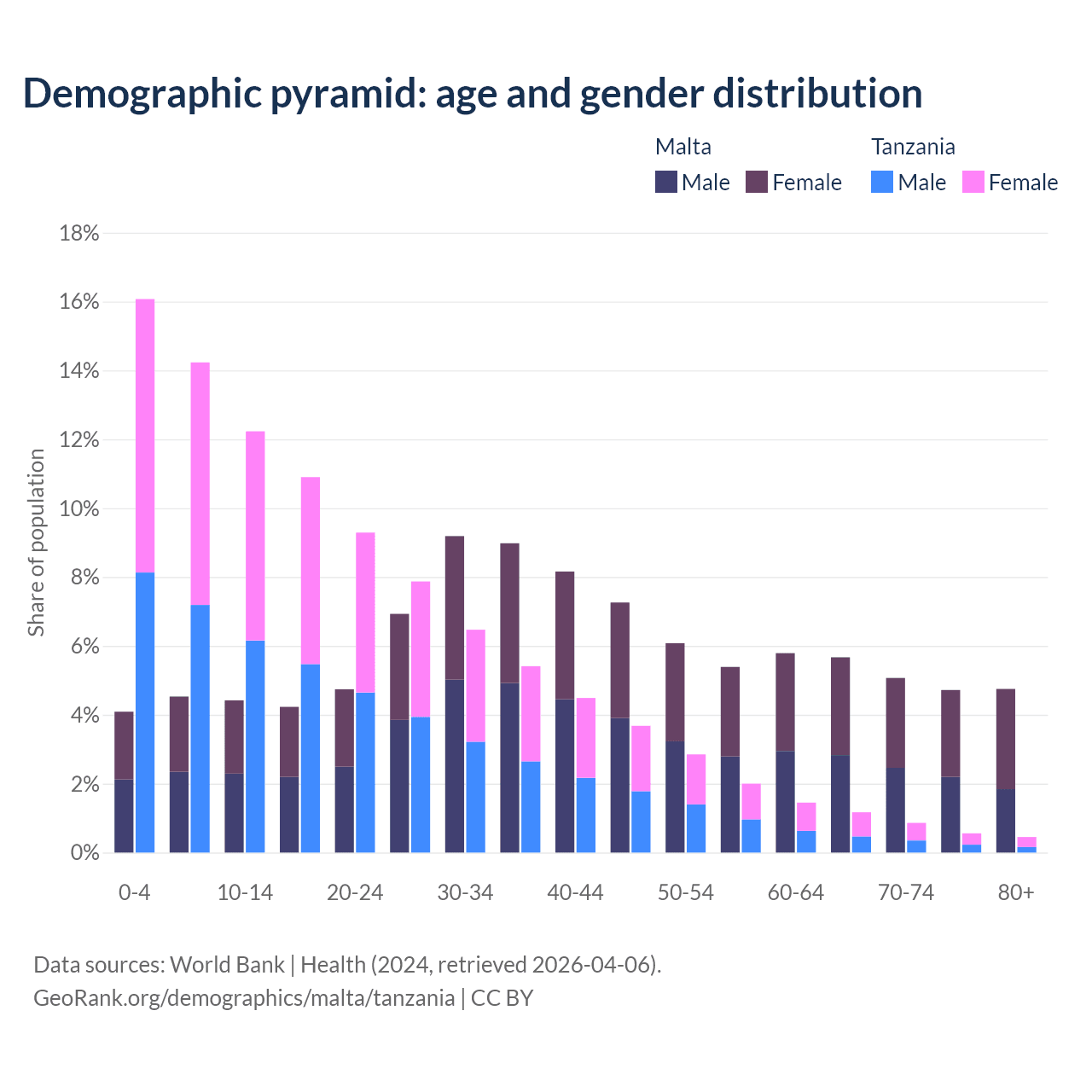 - Malta is ranked 36/196 by median age (oldest to youngest) vs 184/196 for Tanzania.