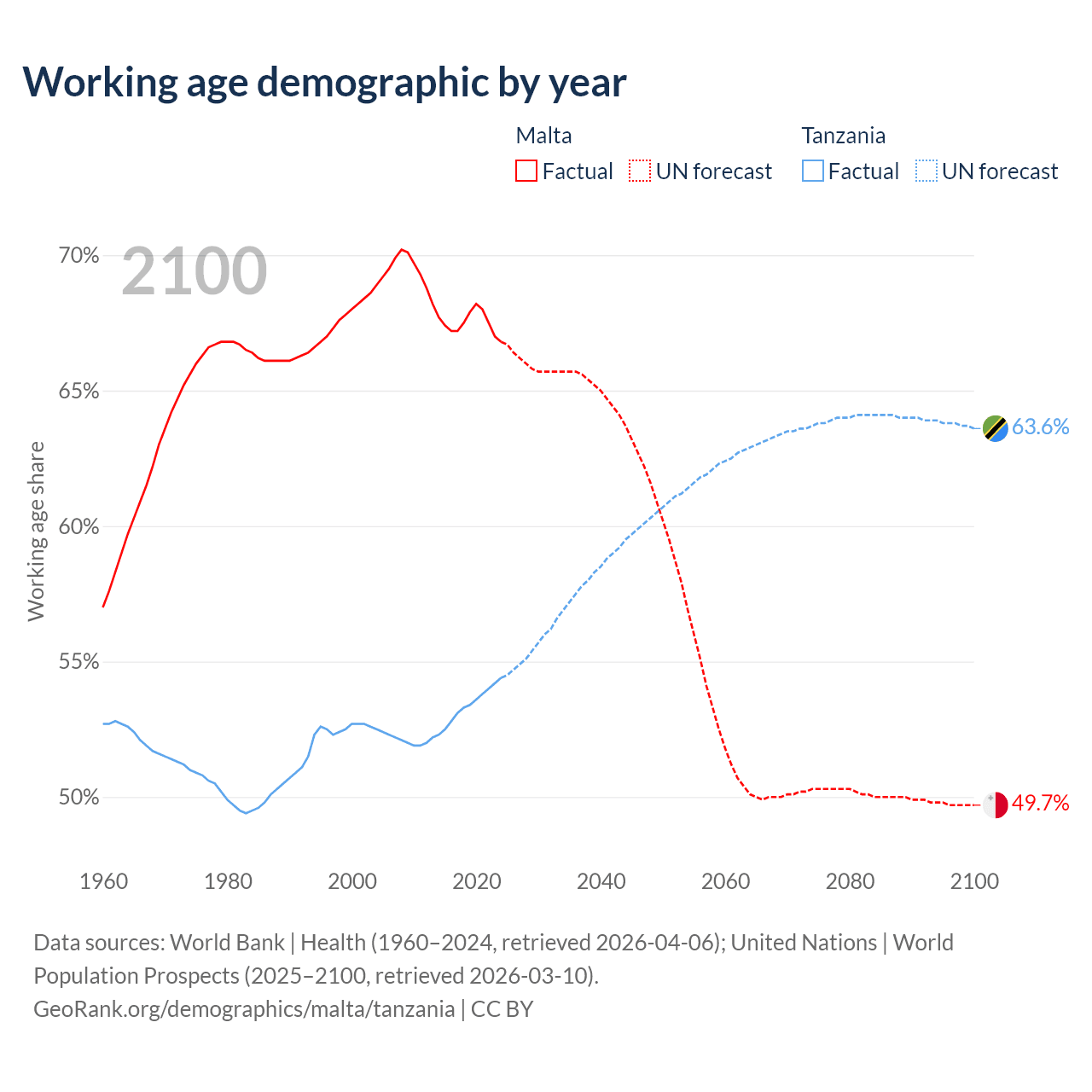 - The share of old-age demographic (65+) in Malta is 20.2% vs 3.05% in Tanzania.