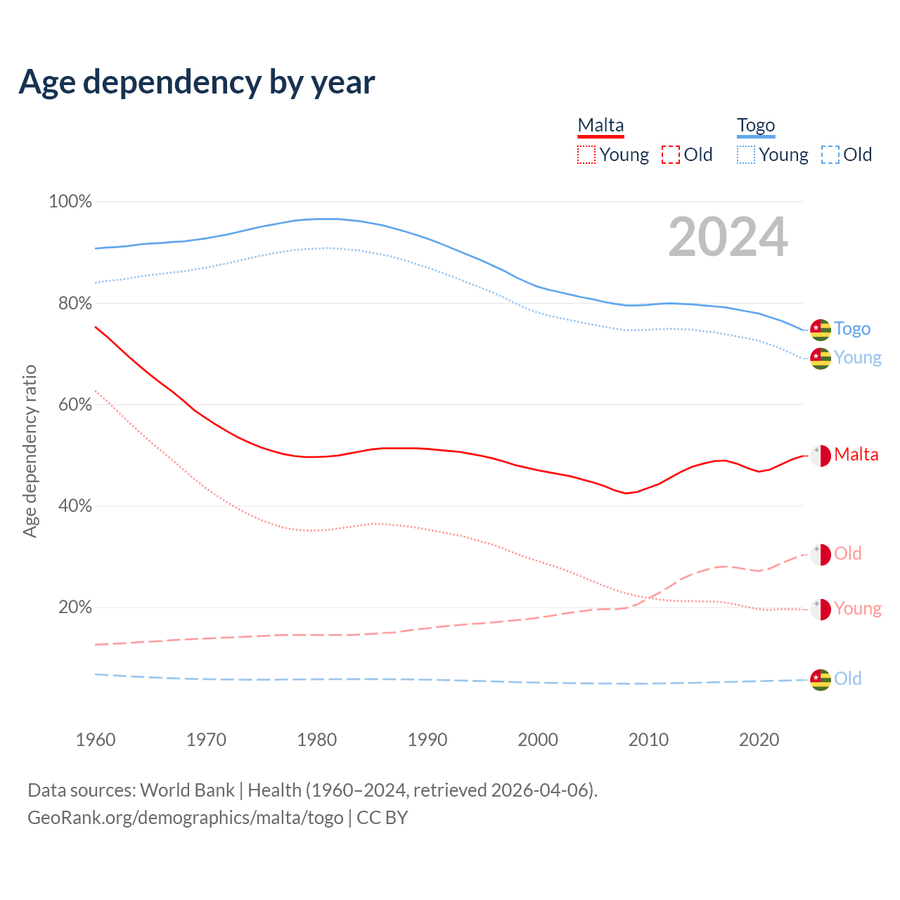 - The share of old-age demographic (65+) in Malta is 20.2% vs 3.21% in Togo.