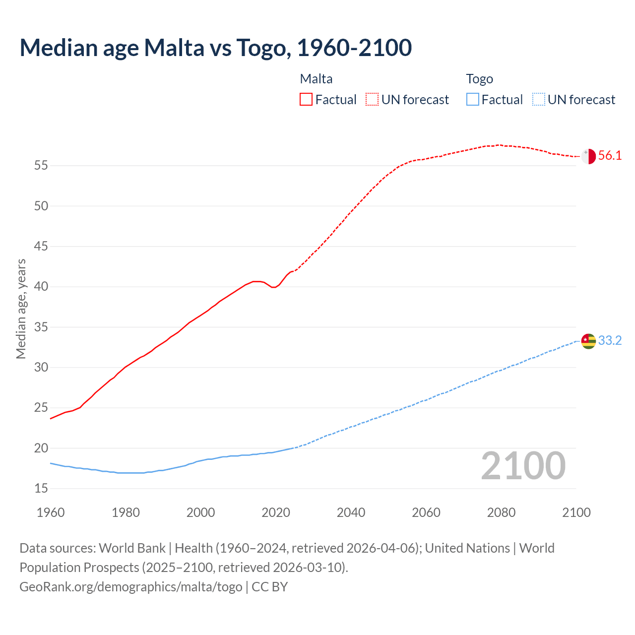 Median age Malta vs Togo, 1960-2100