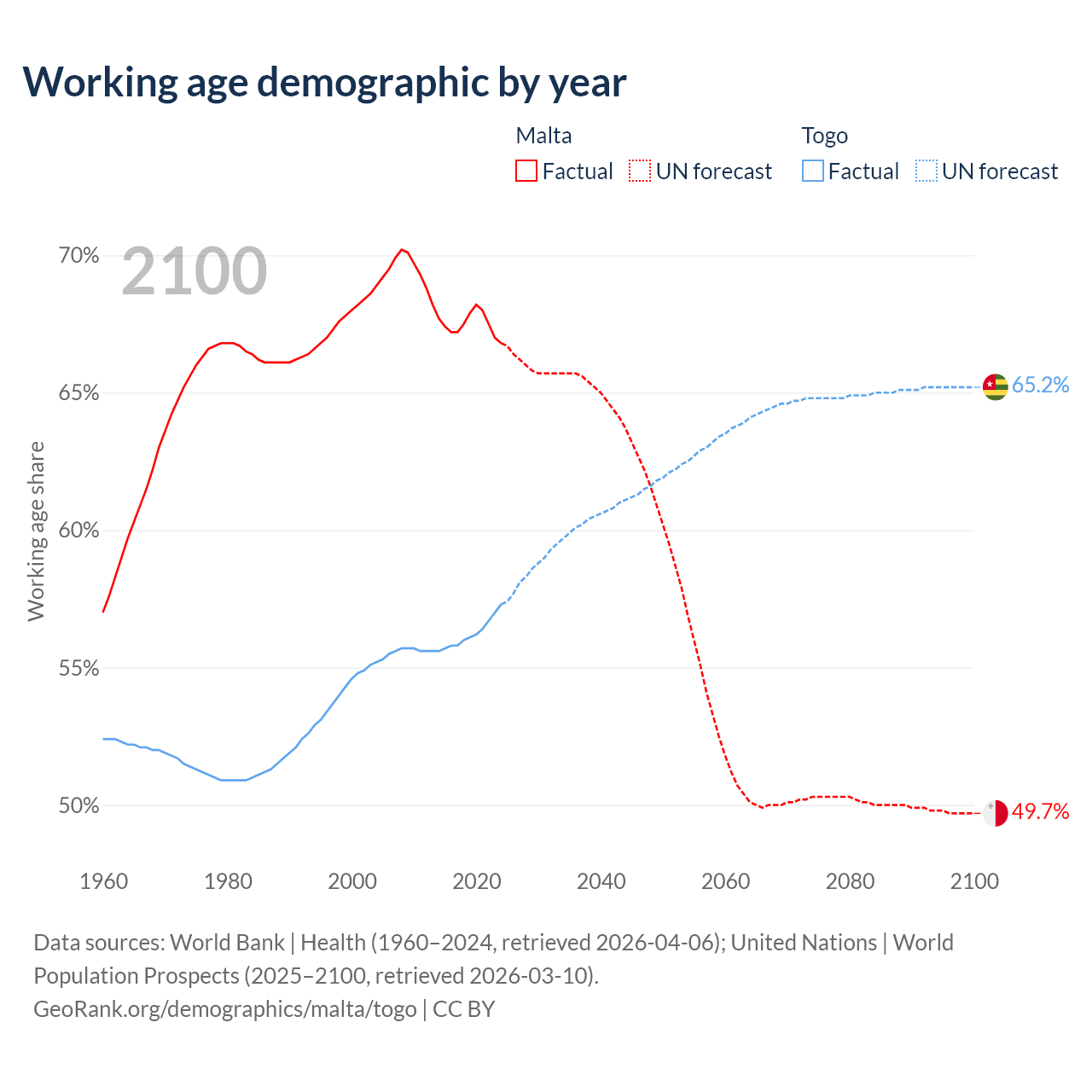 The share of older people aged 65 and over is 20.2% in Malta and 3.21% in Togo. Life expectancy in Malta compared to Togo .