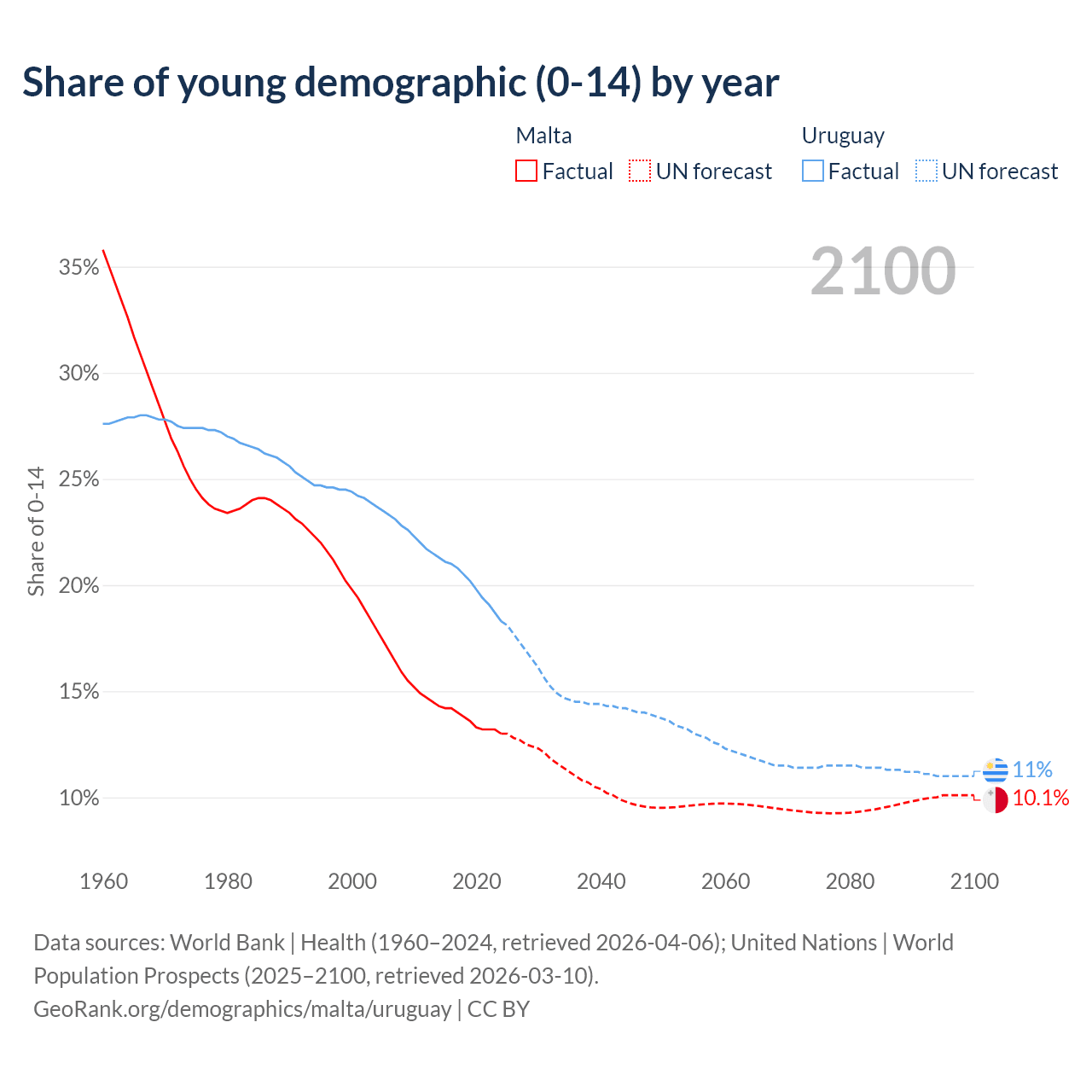 - The share of young demographic (0-15 years old) in Malta is 13% vs 18.3% in Uruguay.