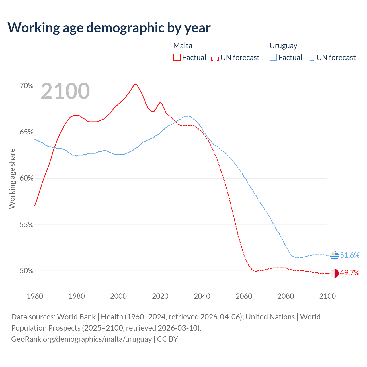 - Malta has 388K working age adults (aged 15-64) vs 2.22M in Uruguay.