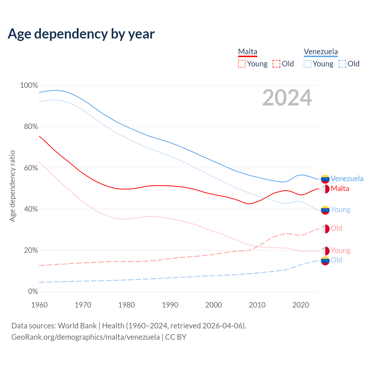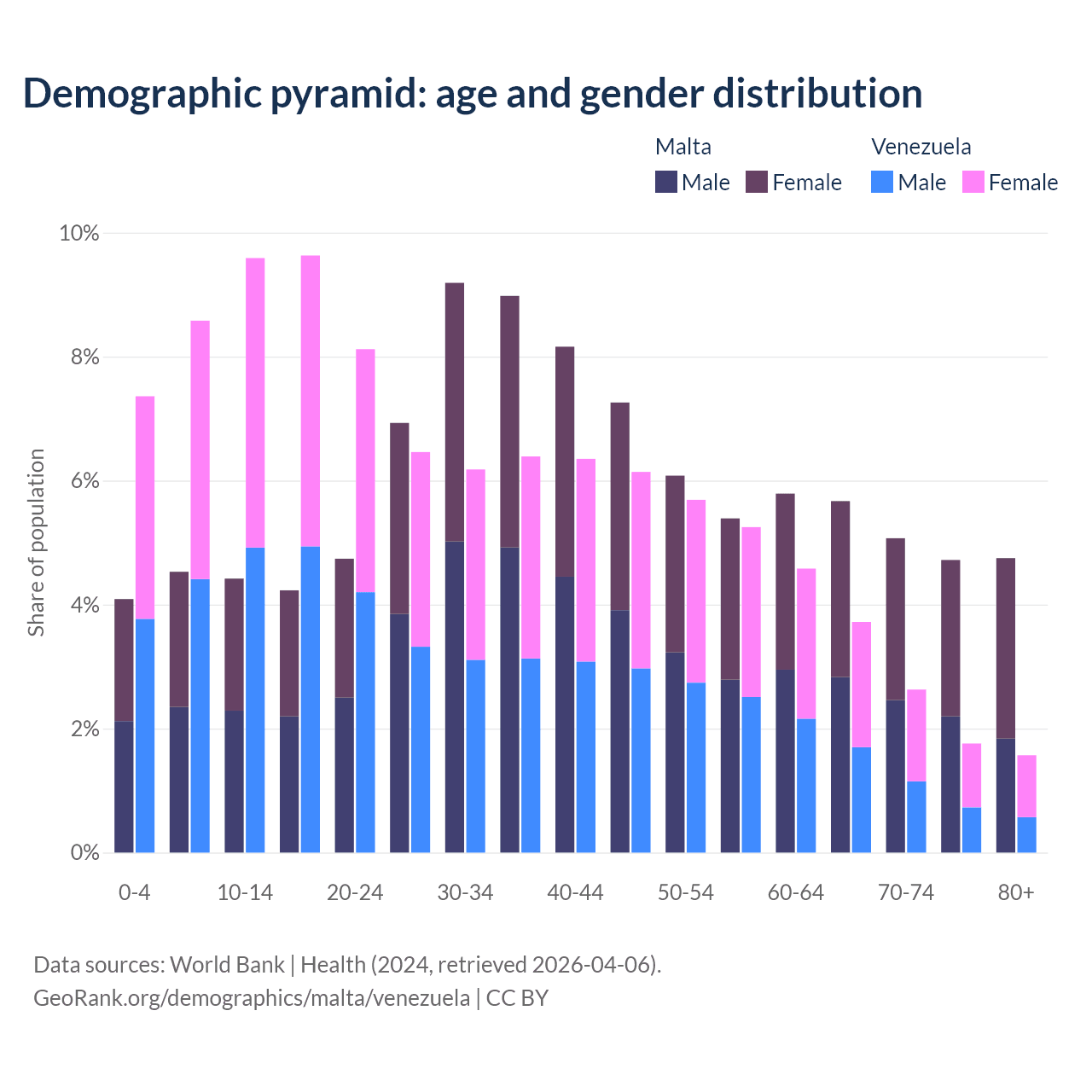 - Malta is ranked 36/196 by median age (oldest to youngest) vs 104/196 for Venezuela.