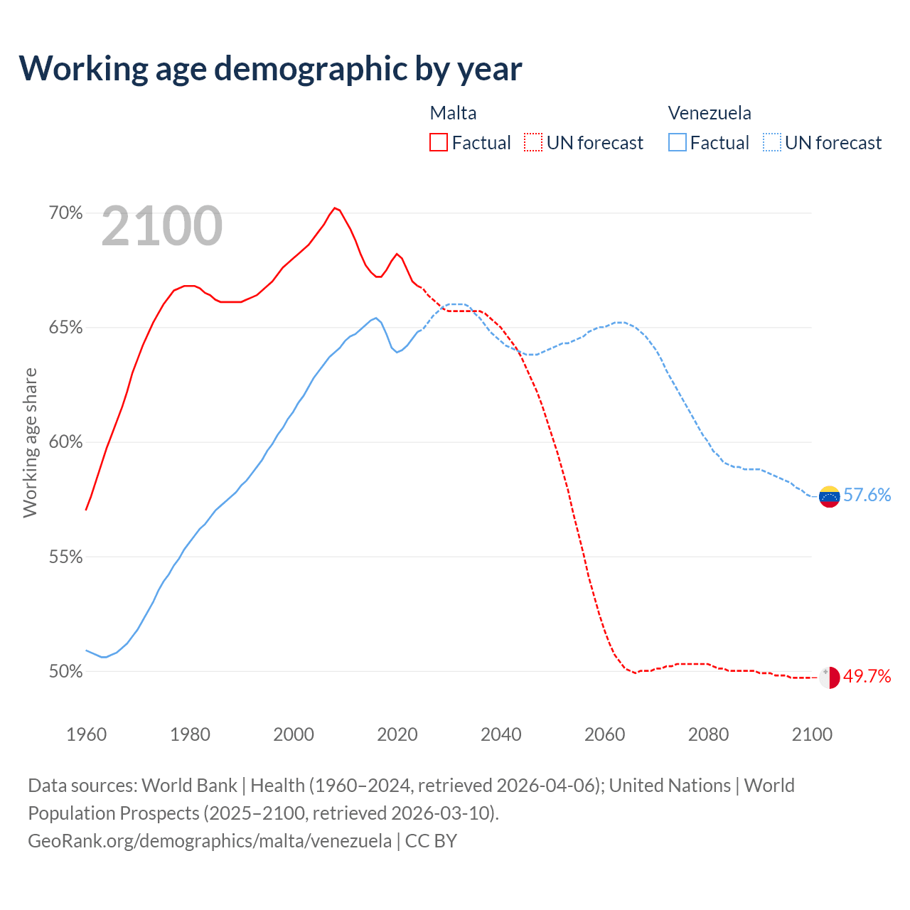 Median age Malta vs Venezuela, 1960-2100