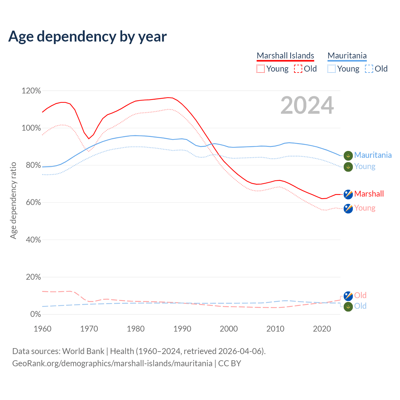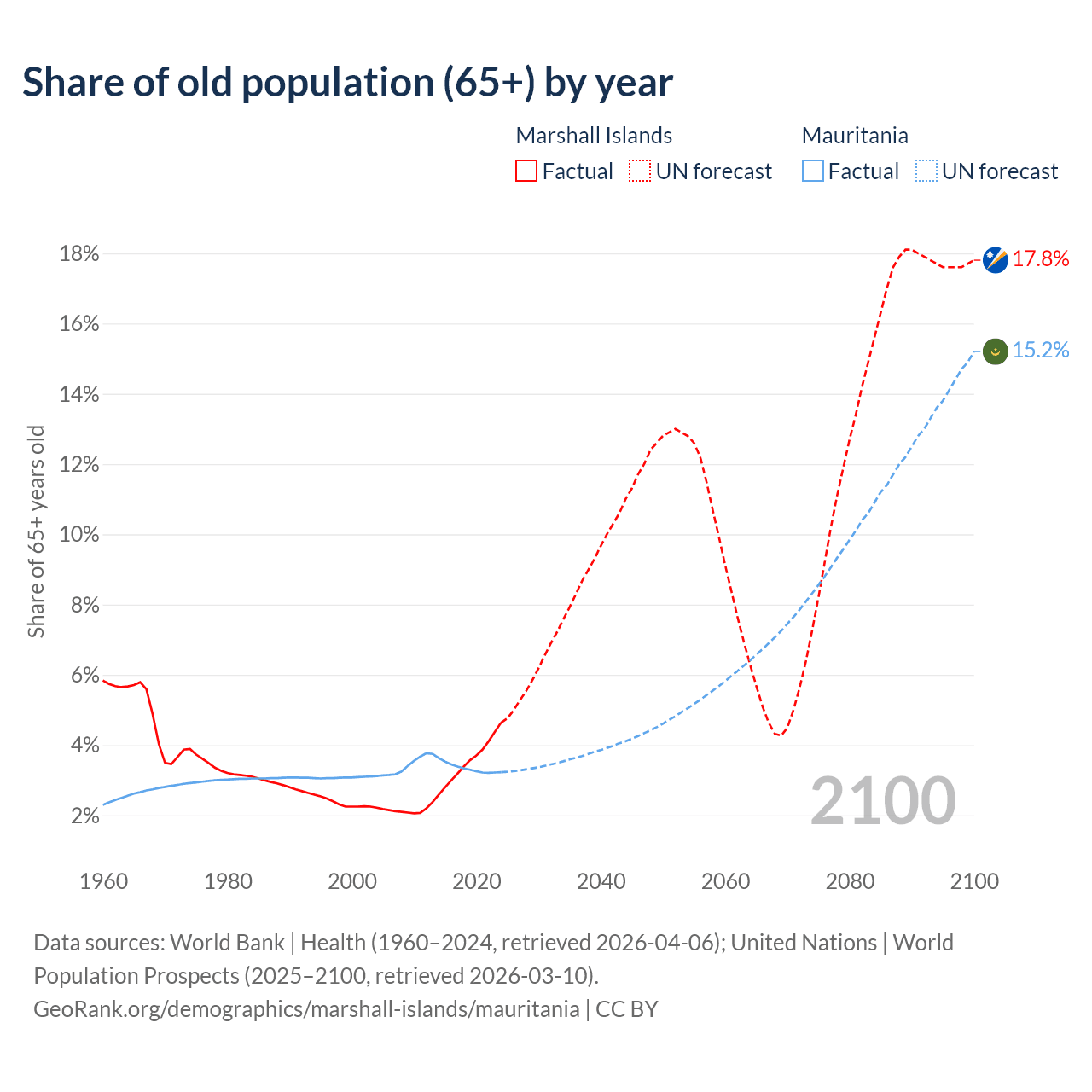 - The share of old-age demographic (65+) in the Marshall Islands is 4.64% vs 3.23% in Mauritania.