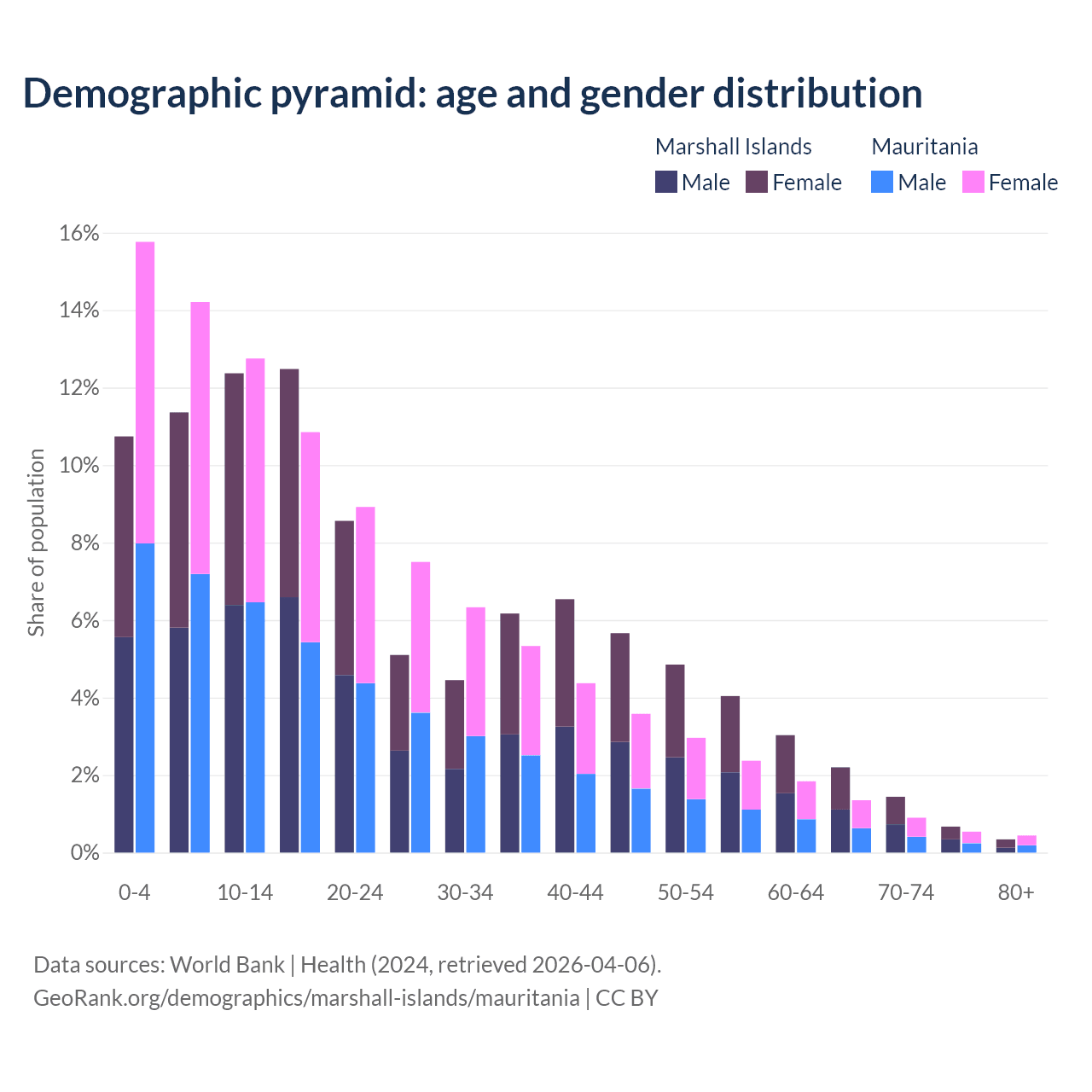 - The share of young demographic (0-15 years old) in the Marshall Islands is 34.5% vs 42.7% in Mauritania.
