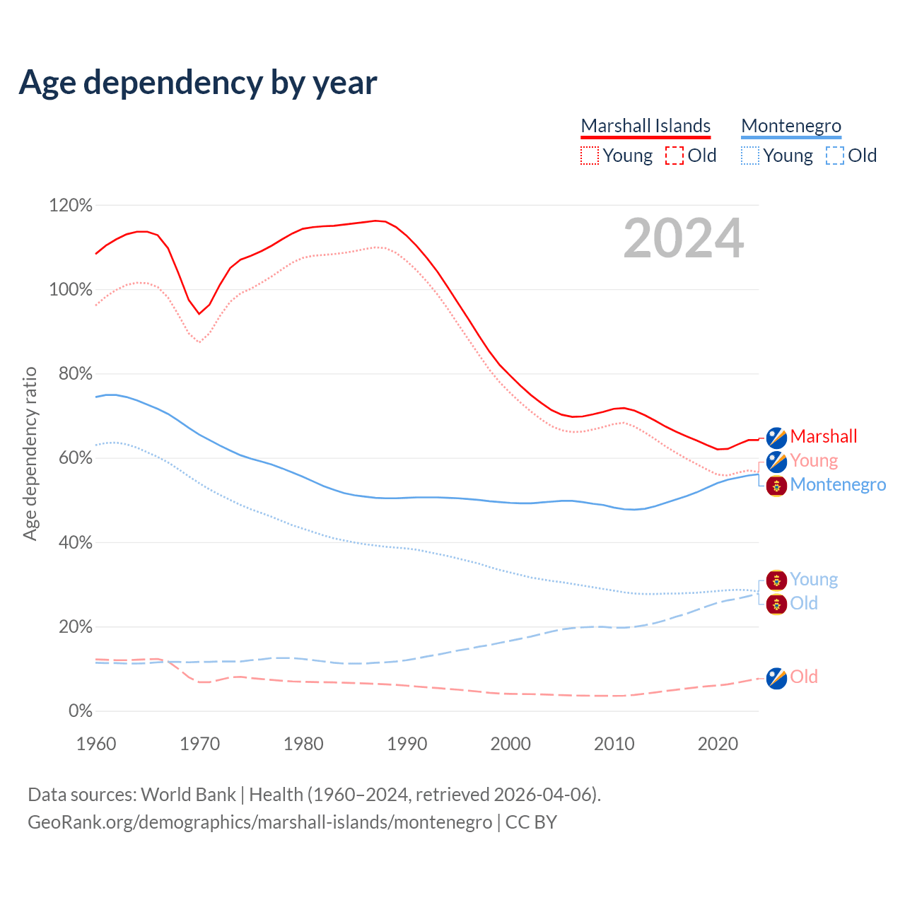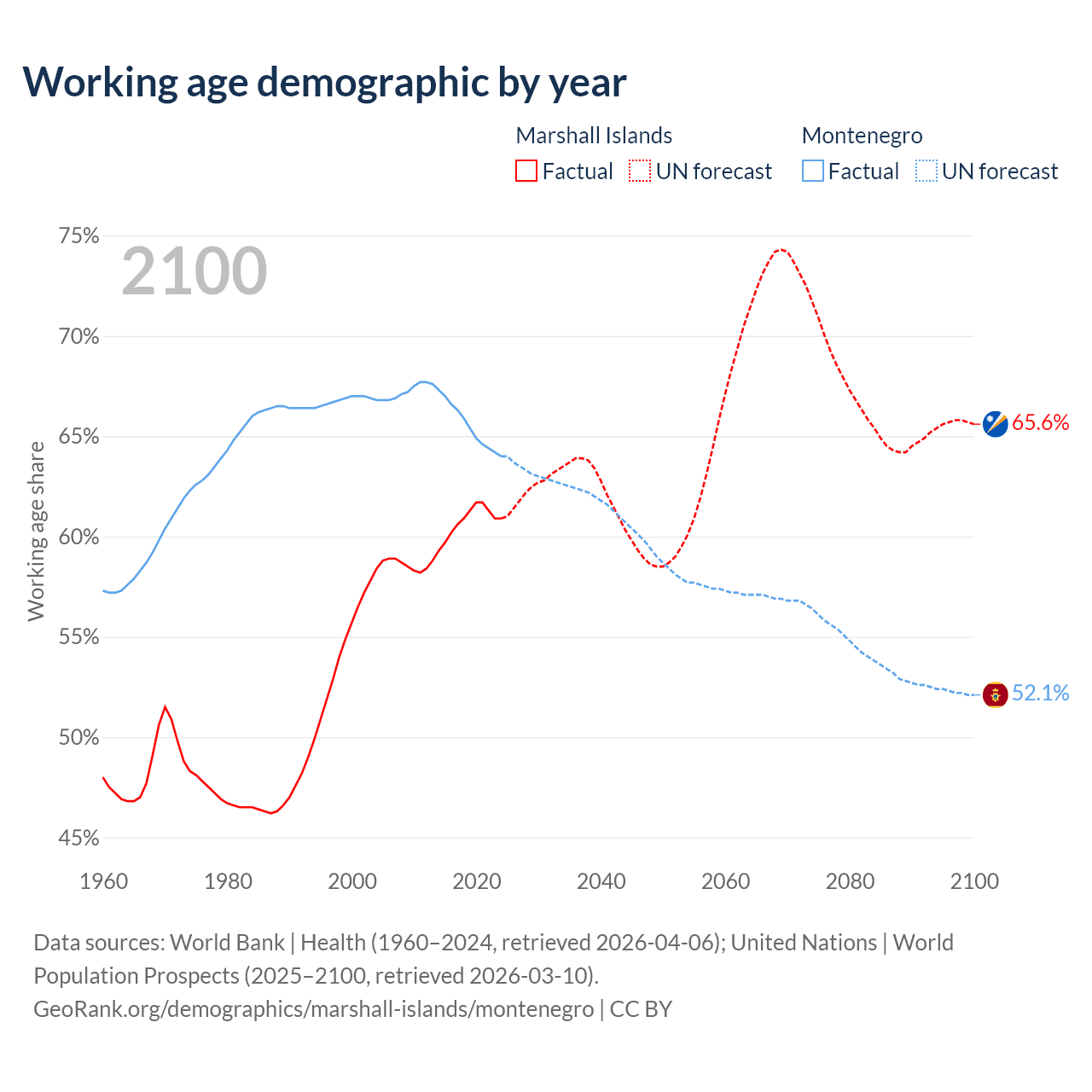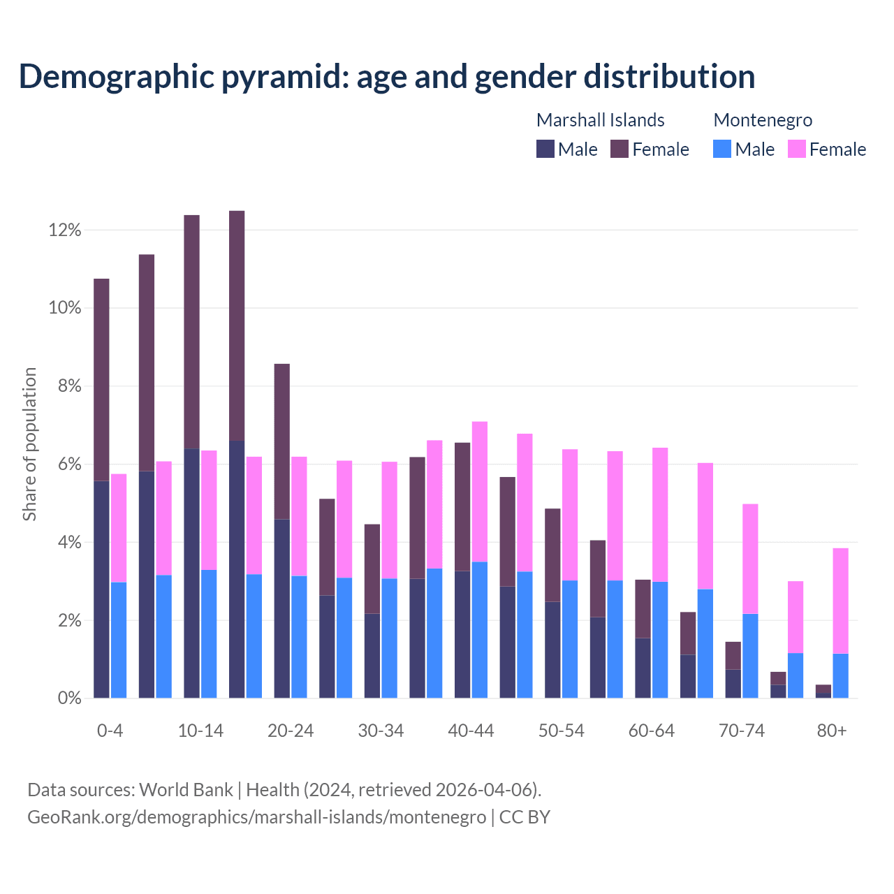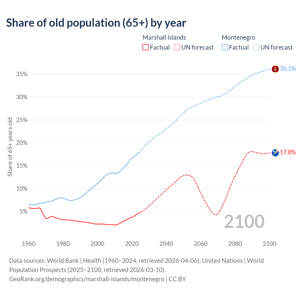 - The share of old-age demographic (65+) in the Marshall Islands is 4.64% vs 17.8% in Montenegro.