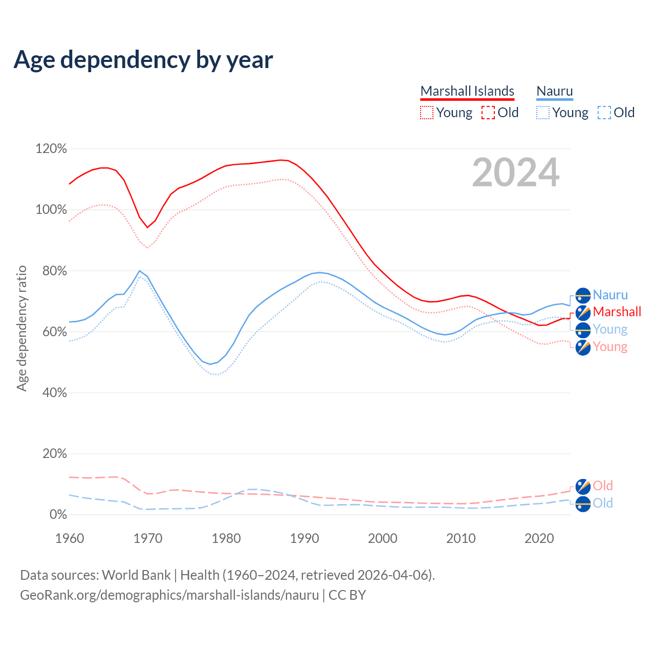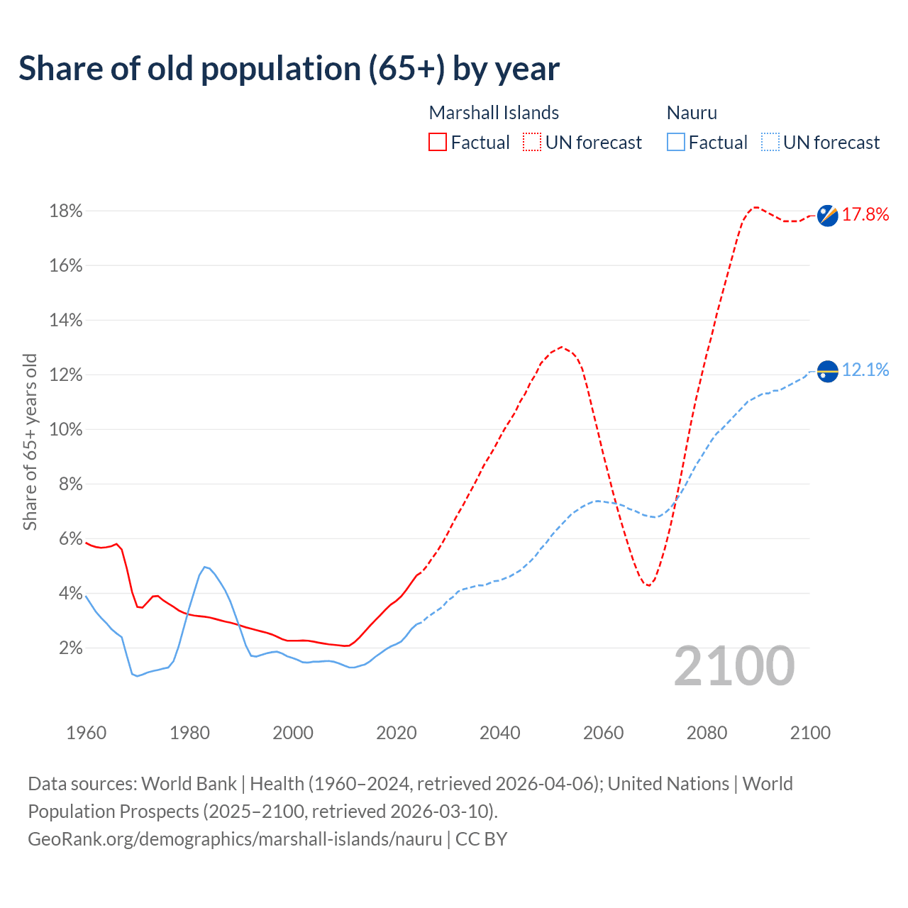 - The share of old-age demographic (65+) in the Marshall Islands is 4.64% vs 2.85% in Nauru.
