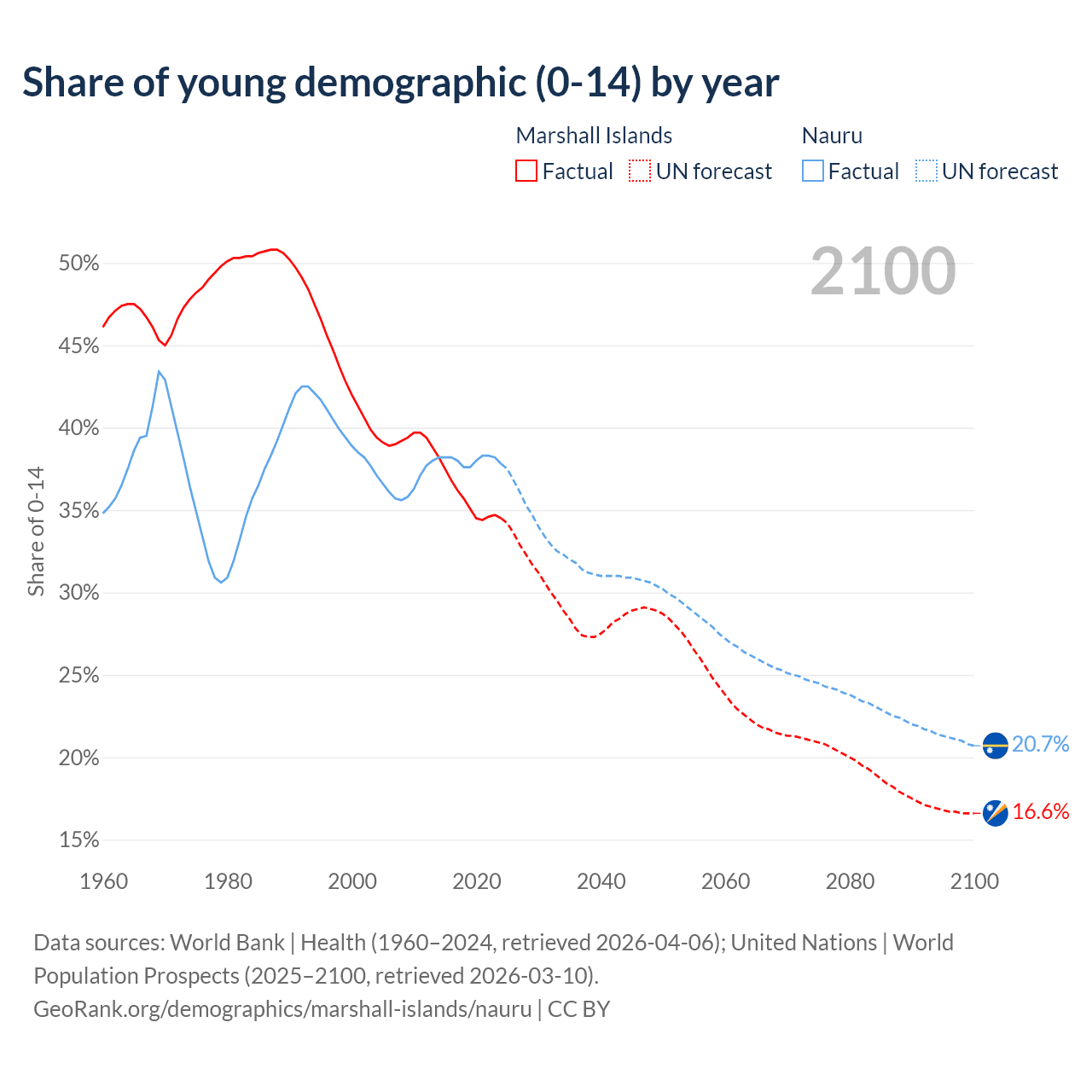 - The share of young demographic (0-15 years old) in the Marshall Islands is 34.5% vs 37.8% in Nauru.