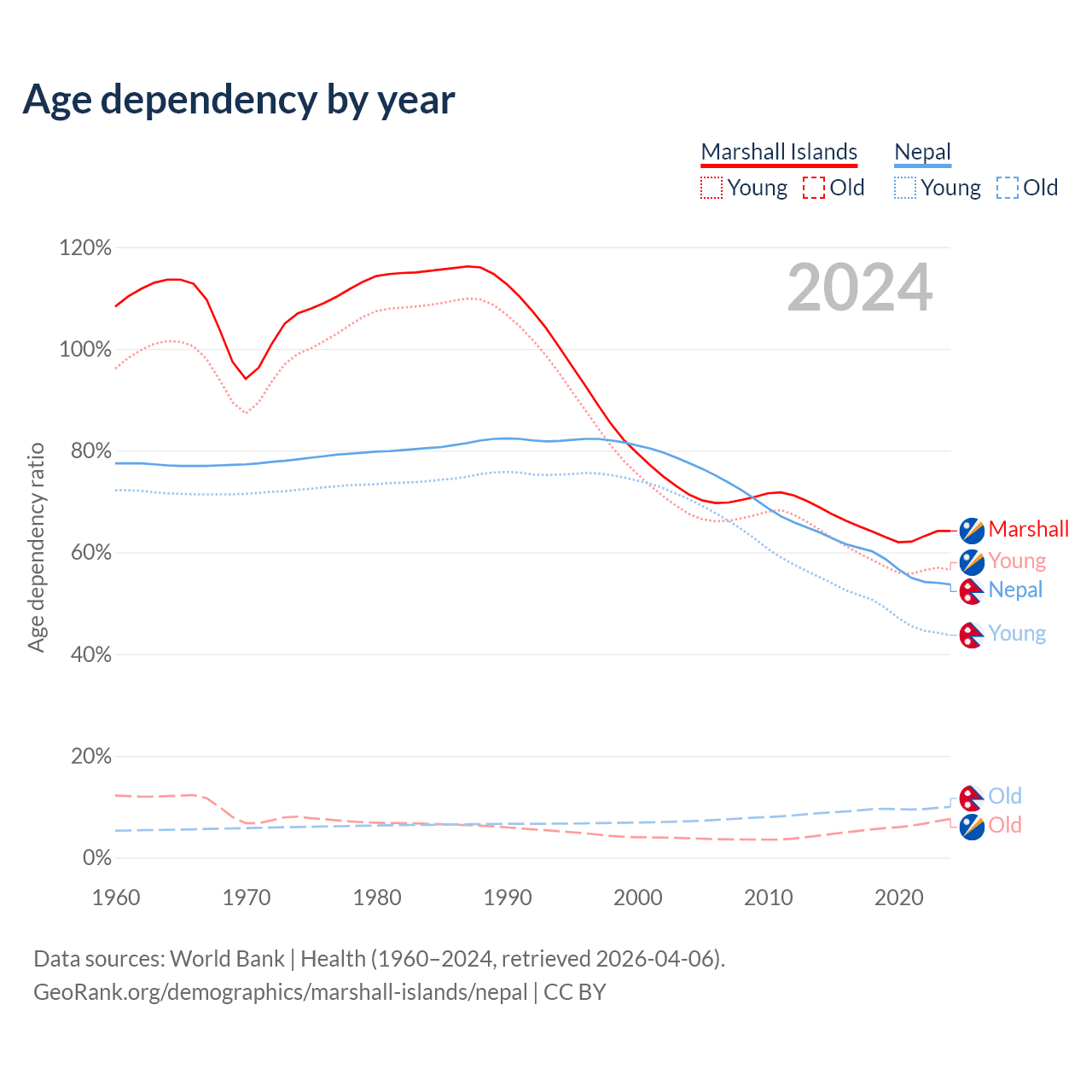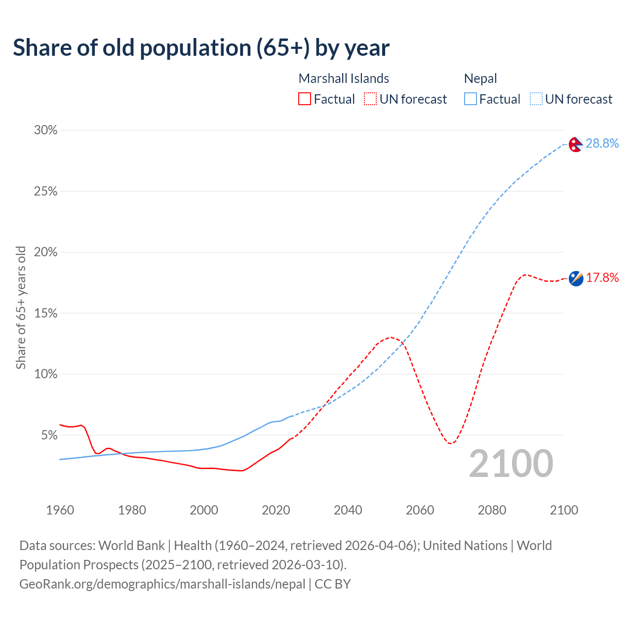 - The share of old-age demographic (65+) in the Marshall Islands is 4.64% vs 6.5% in Nepal.