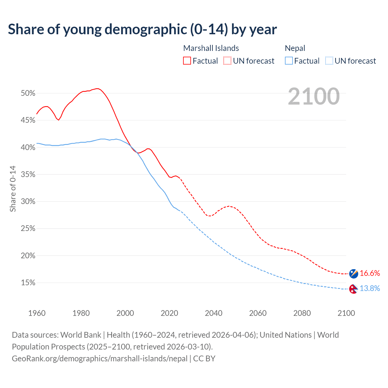 - The share of young demographic (0-15 years old) in the Marshall Islands is 34.5% vs 28.4% in Nepal.