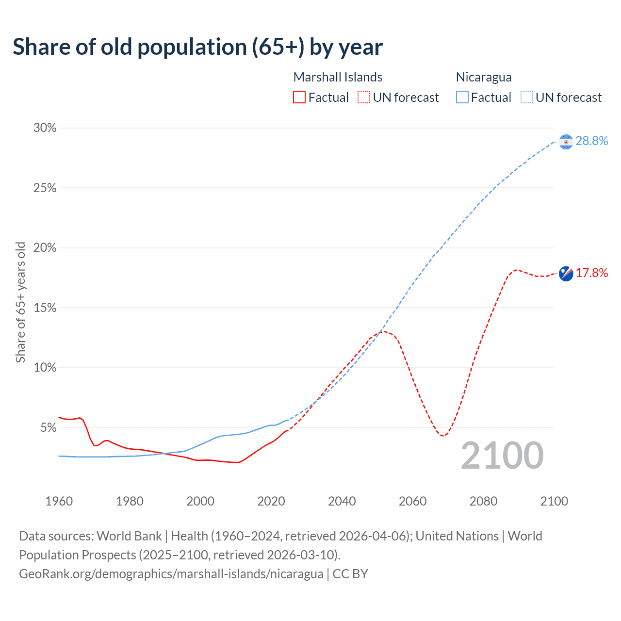 - The share of old-age demographic (65+) in the Marshall Islands is 4.64% vs 5.53% in Nicaragua.