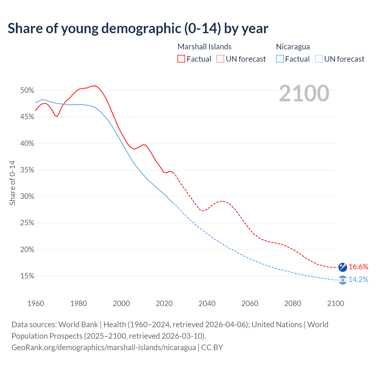 - The share of young demographic (0-15 years old) in the Marshall Islands is 34.5% vs 28.8% in Nicaragua.