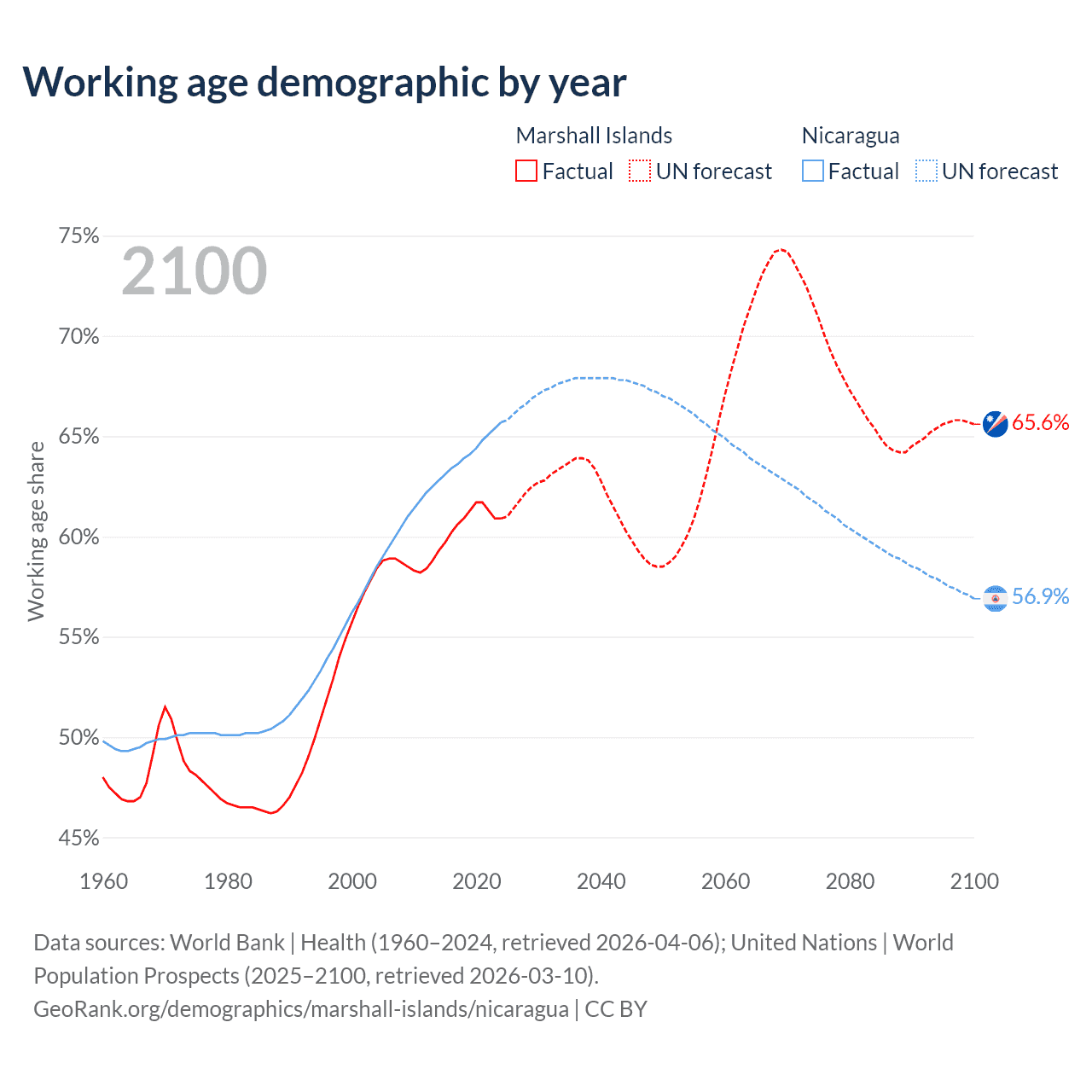- The Marshall Islands has 21.3K working age adults (aged 15-64) vs 4.68M in Nicaragua.