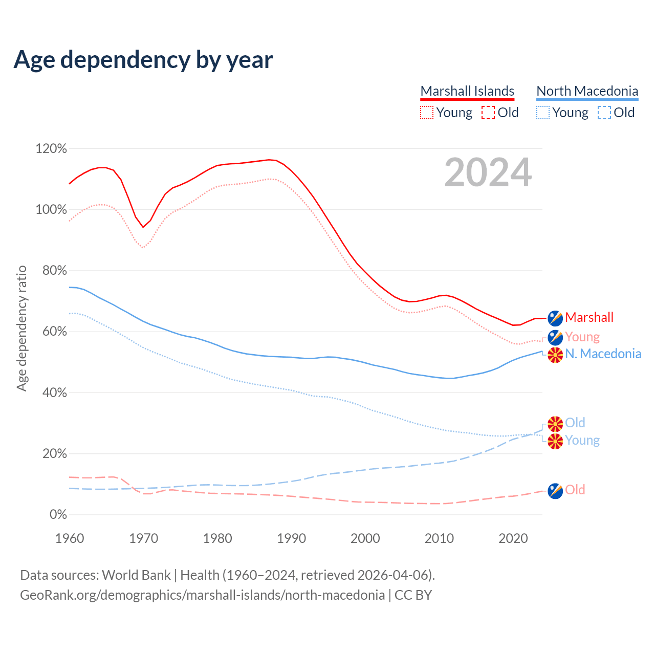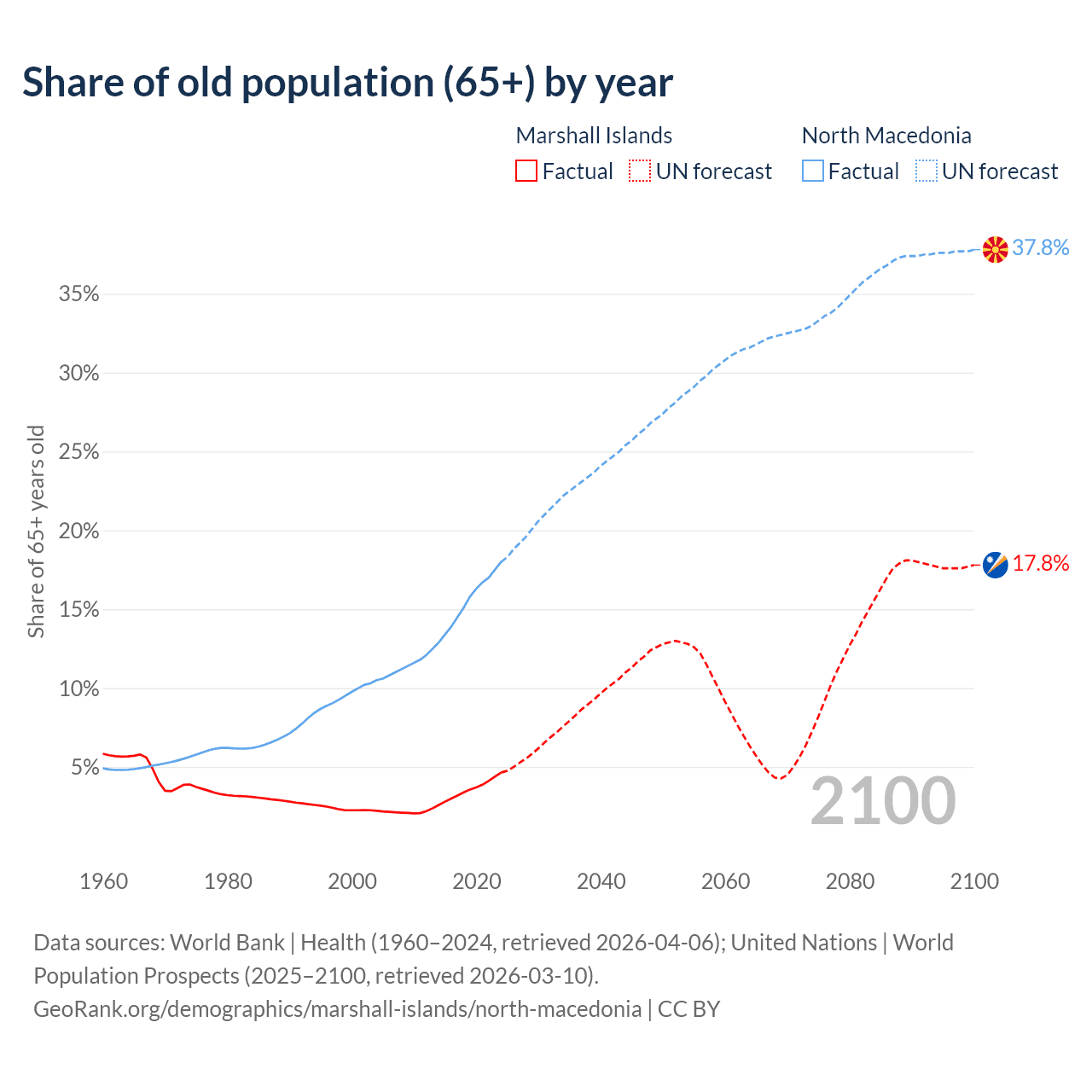 - The share of old-age demographic (65+) in the Marshall Islands is 4.64% vs 18% in North Macedonia.