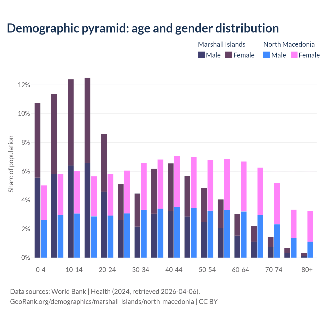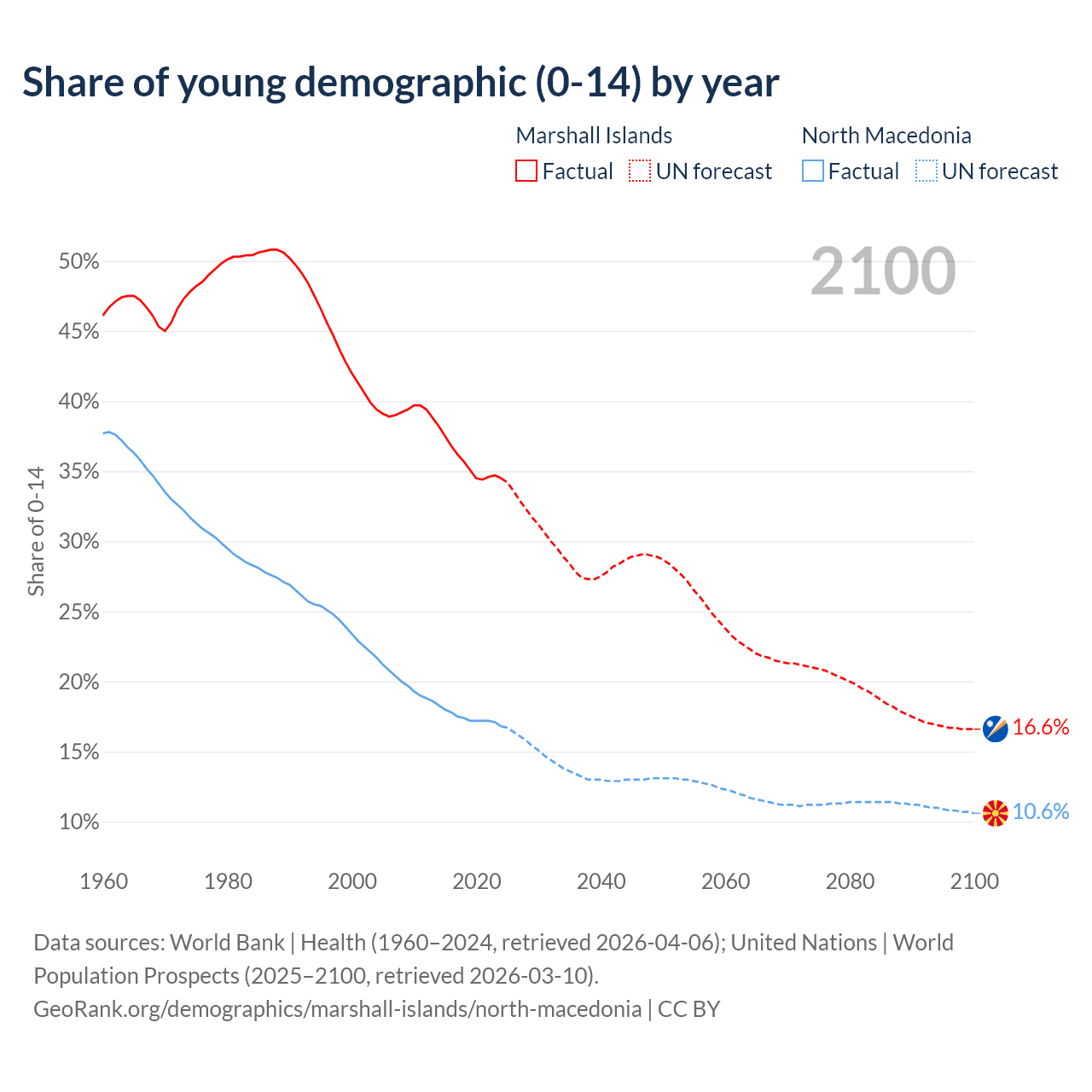- The share of young demographic (0-15 years old) in the Marshall Islands is 34.5% vs 16.8% in North Macedonia.