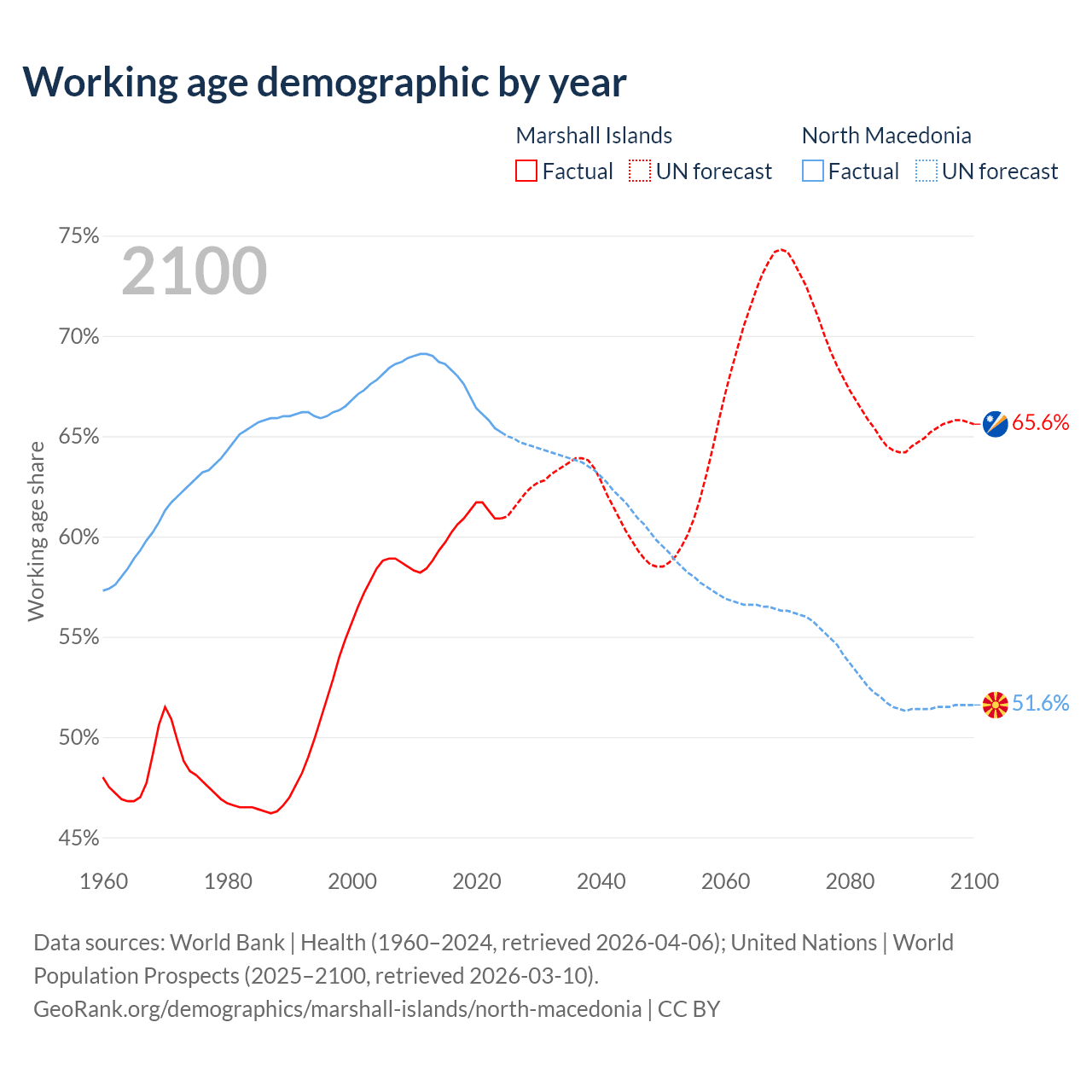 - The Marshall Islands has 21.3K working age adults (aged 15-64) vs 1.18M in North Macedonia.