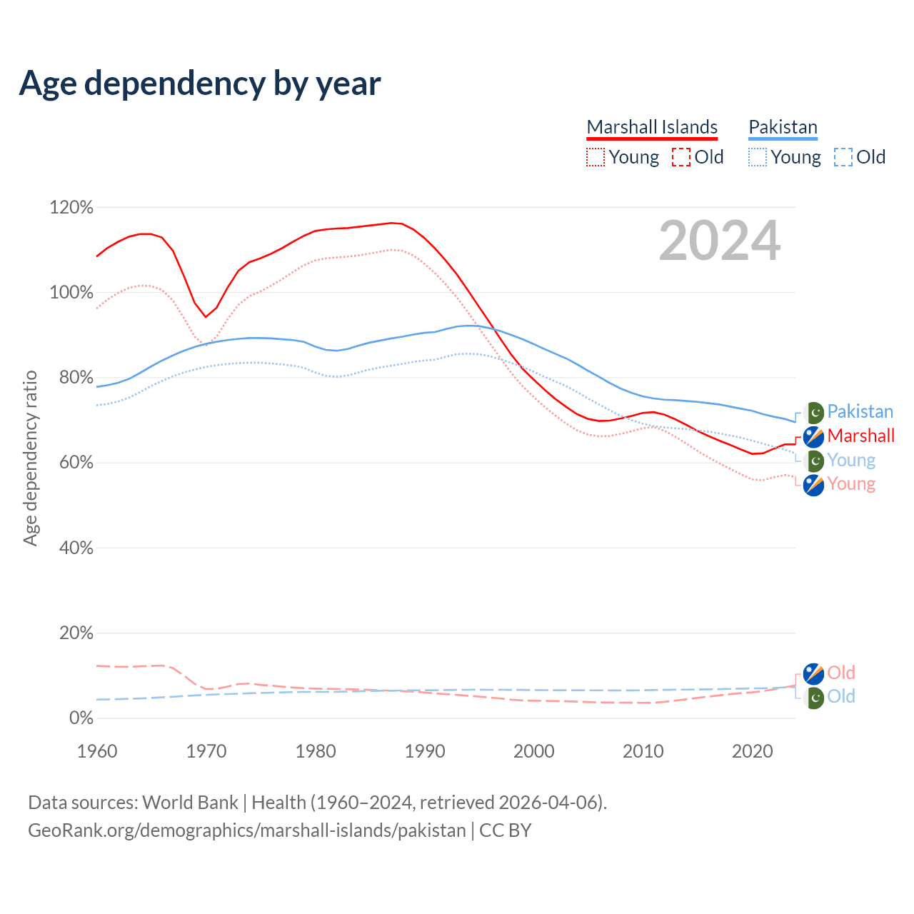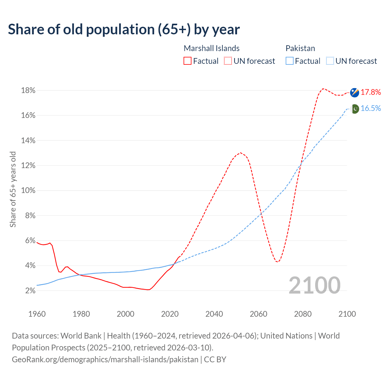 - The share of old-age demographic (65+) in the Marshall Islands is 4.64% vs 4.28% in Pakistan.