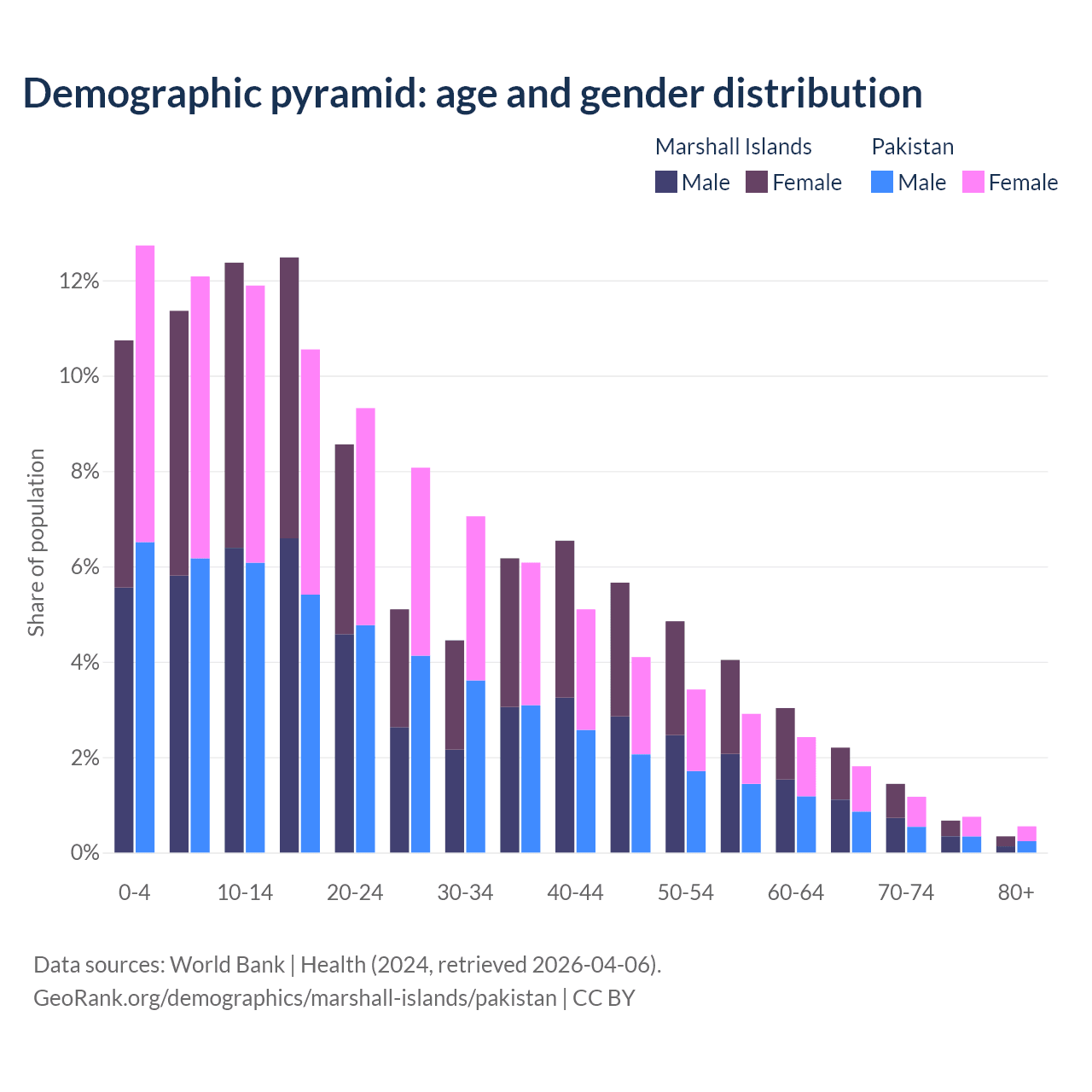 - The share of young demographic (0-15 years old) in the Marshall Islands is 34.5% vs 36.7% in Pakistan.