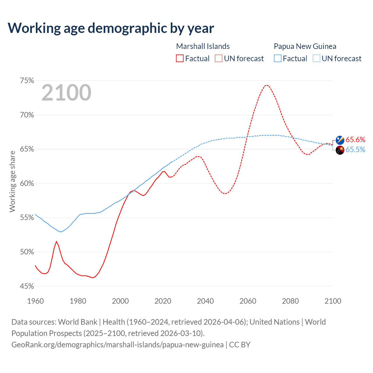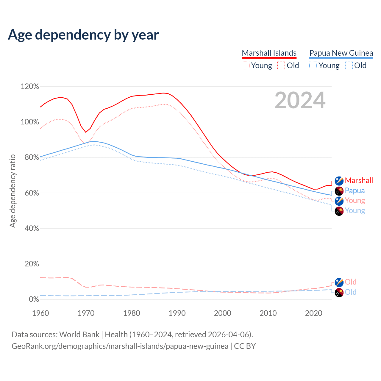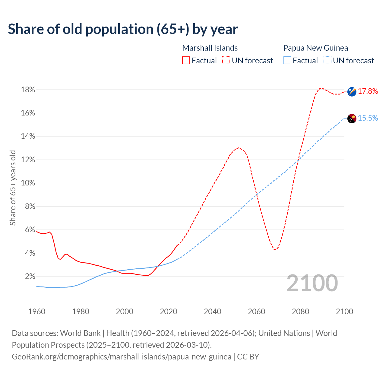 - The share of old-age demographic (65+) in the Marshall Islands is 4.64% vs 3.46% in Papua New Guinea.