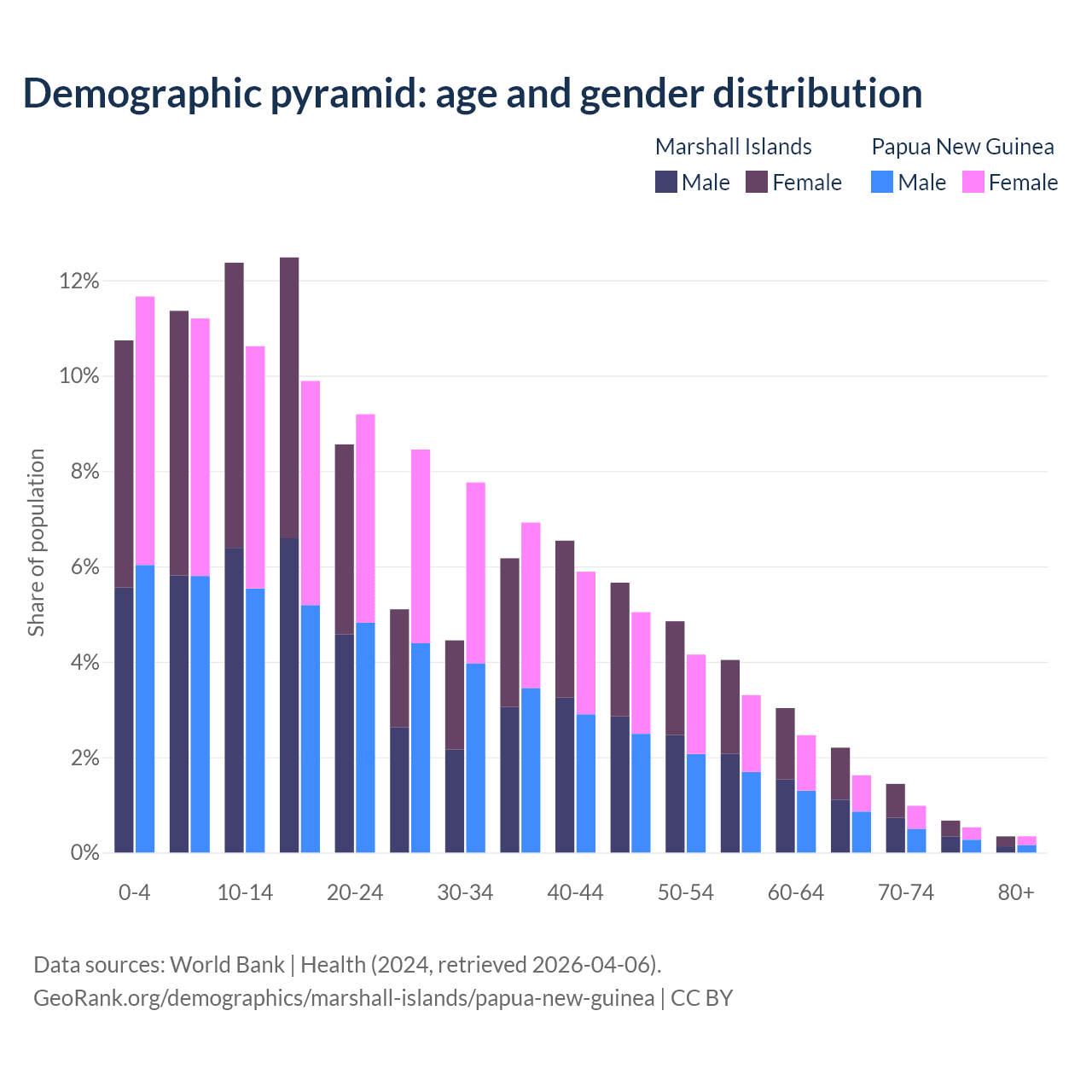 - The share of young demographic (0-15 years old) in the Marshall Islands is 34.5% vs 33.5% in Papua New Guinea.