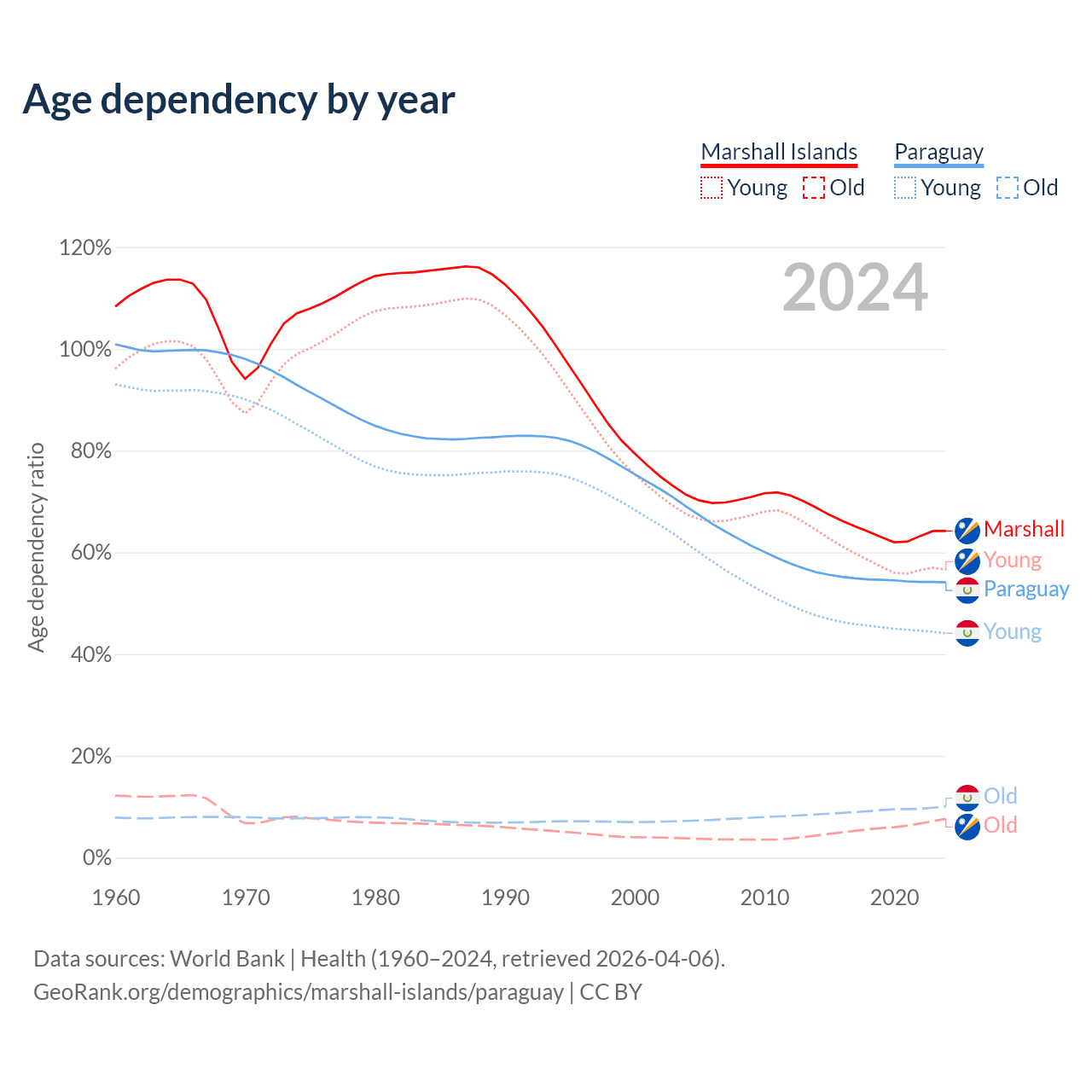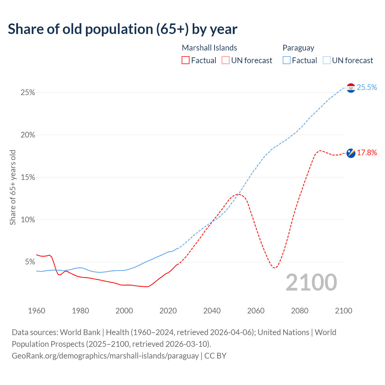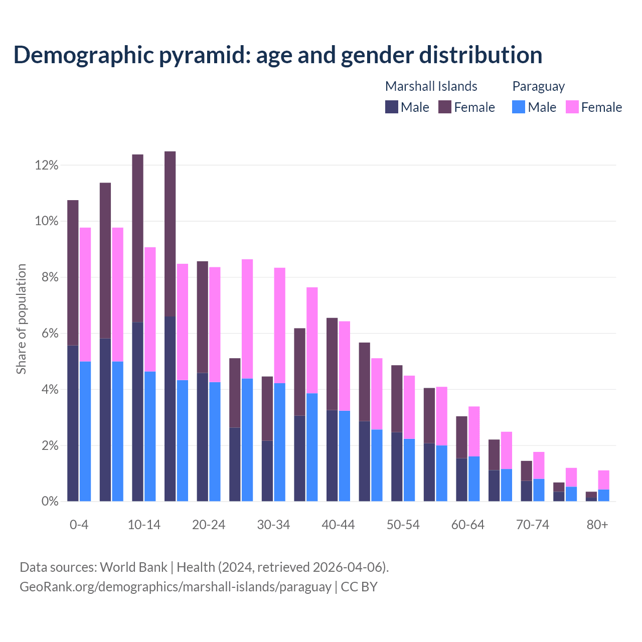 - The share of old-age demographic (65+) in the Marshall Islands is 4.64% vs 6.54% in Paraguay.